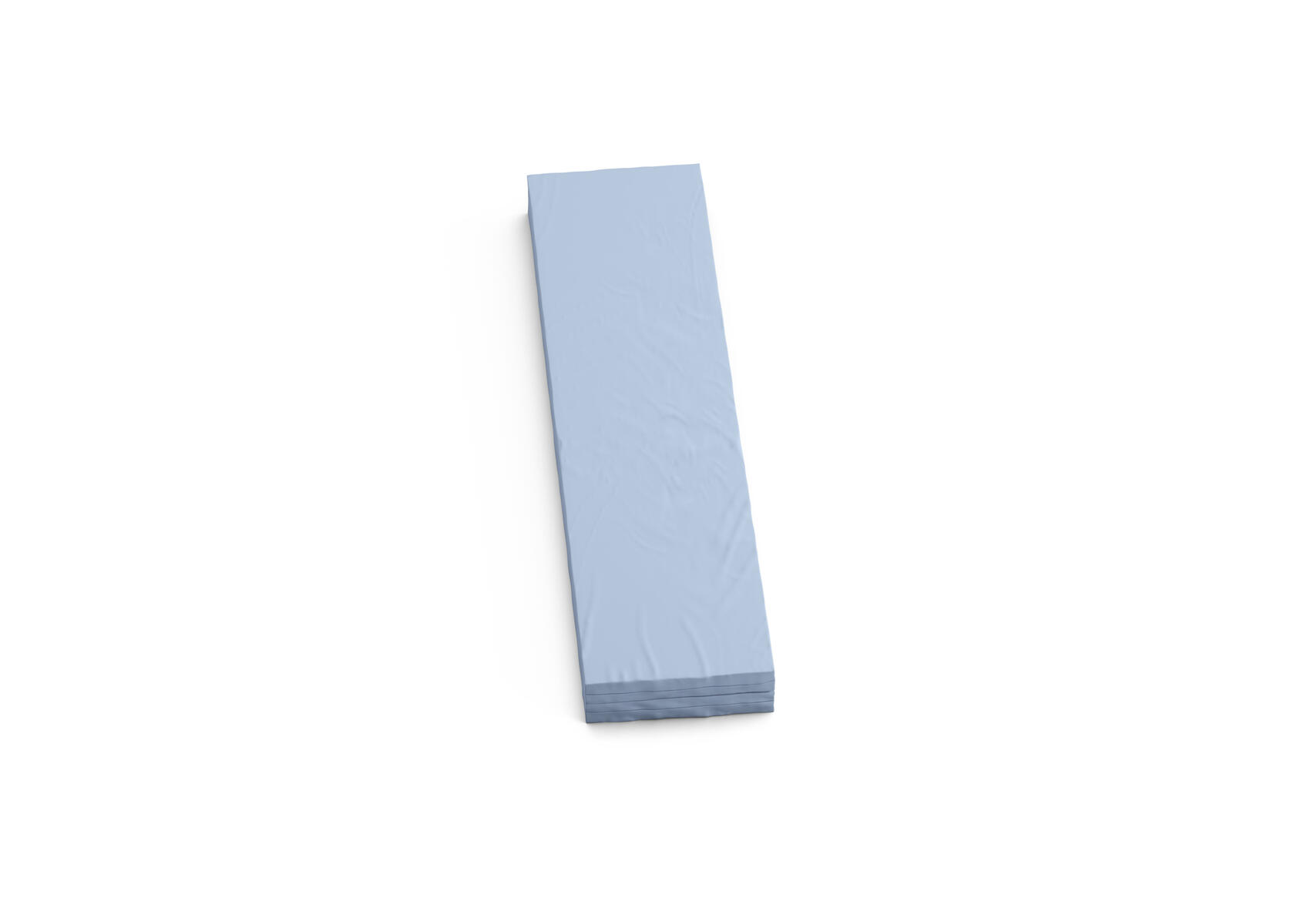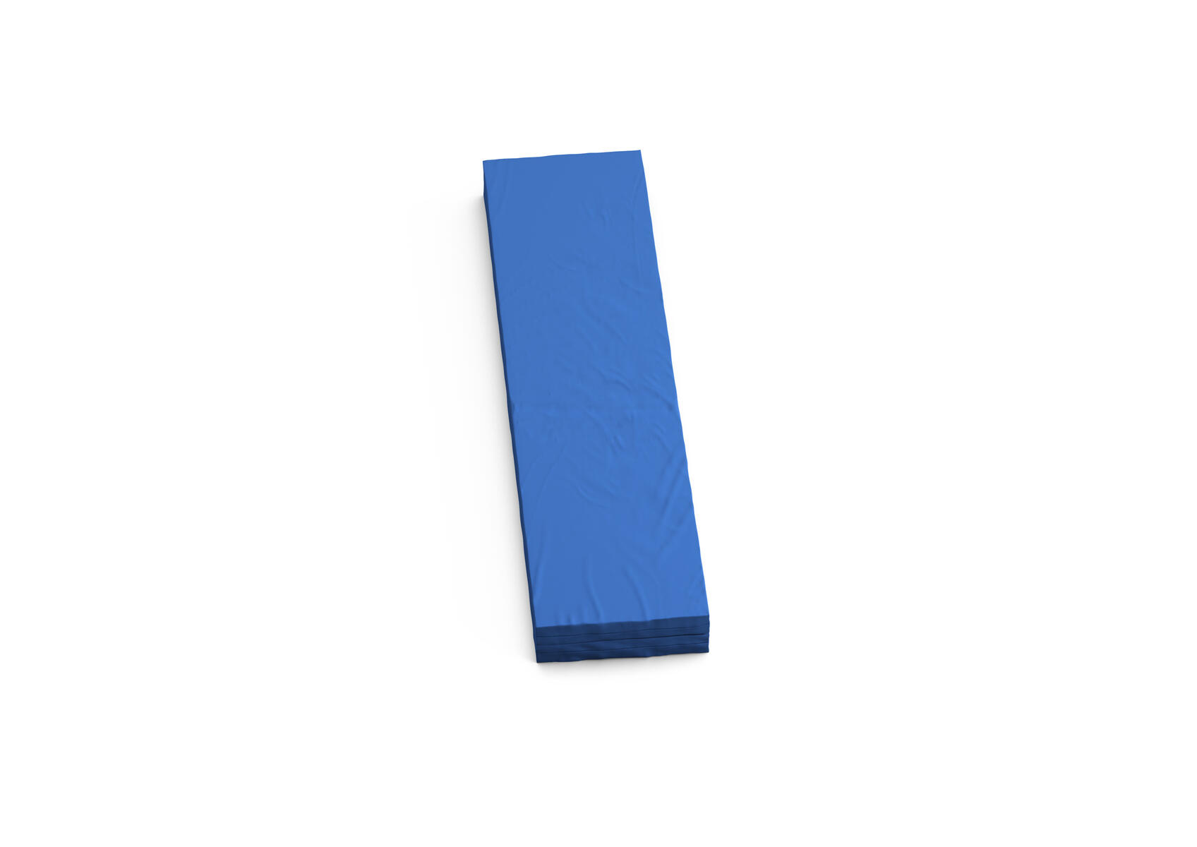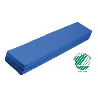 Svanenmärkt vilmadrass helt utan PVC med kallskumskärna. Blå. Mått: 117x54x4 cm utfälld, 117x27x8 cm ihopvikt. Blått fodral av 2-skiktsmaterial bestående av 49 % polyuretan och 51 % polyesterväv. Vattentät. Avtorkningsbar med våt trasa och maskintvätt i upp till 60 °C. Svanenmärkt, licensnummer 3031 0084.