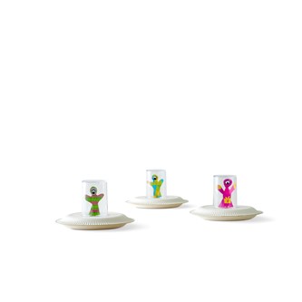 Lägg framsidorna av papptallrikarna mot varandra och limma ihop dem. Klipp därefter ut en alien-kropp, cirka 8 cm hög, i mönstrat hobbypapper. Klipp den nedersta centimetern på mitten, vik den ena delen framåt och den andra delen bakåt. Limma fast din alien på papptallriken så att den står upp. Klistra på ett öga. Limma därefter en pennkopp upp och ner över din alien.