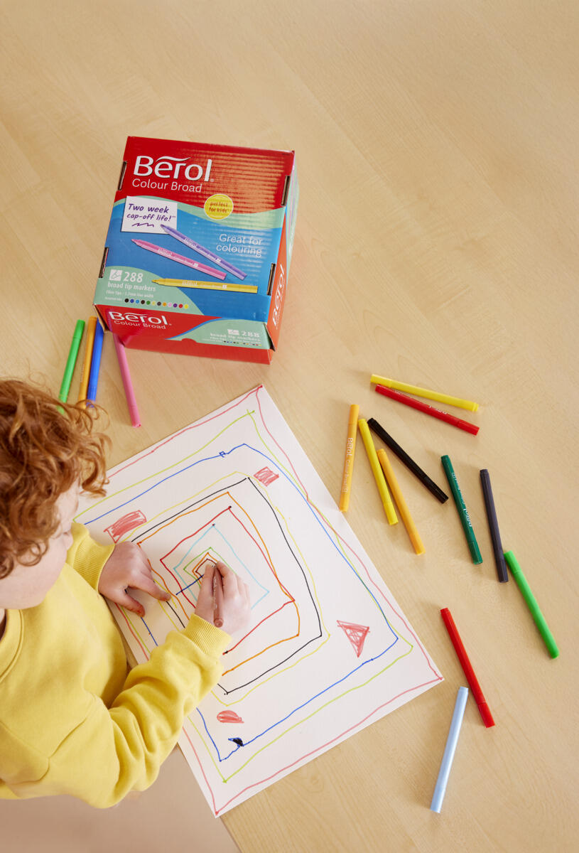 288 st/fp. Fiberpennor från Berol av hög kvalitet. 12 klara nyanser, 24 pennor av varje färg. Innehåller gul, orange, röd, rosa, lila, blå, mörkblå, ljusgrön, grön, grå, brun, svart. Tålig, bred och rundad spets. Flödigt bläck som passar färgläggning av lite större ytor och inte blöder igenom ritpapper. Ventilerad huv och pennkropp av plast, i samma nyanser som bläcket. Pennan kan ligga utan huv i upp till två veckor utan att torka ut. Linjebredd 1,2 mm. Längd 135 mm. ø 11 mm. CE-märkta. PVC-fri. Från 3 år.