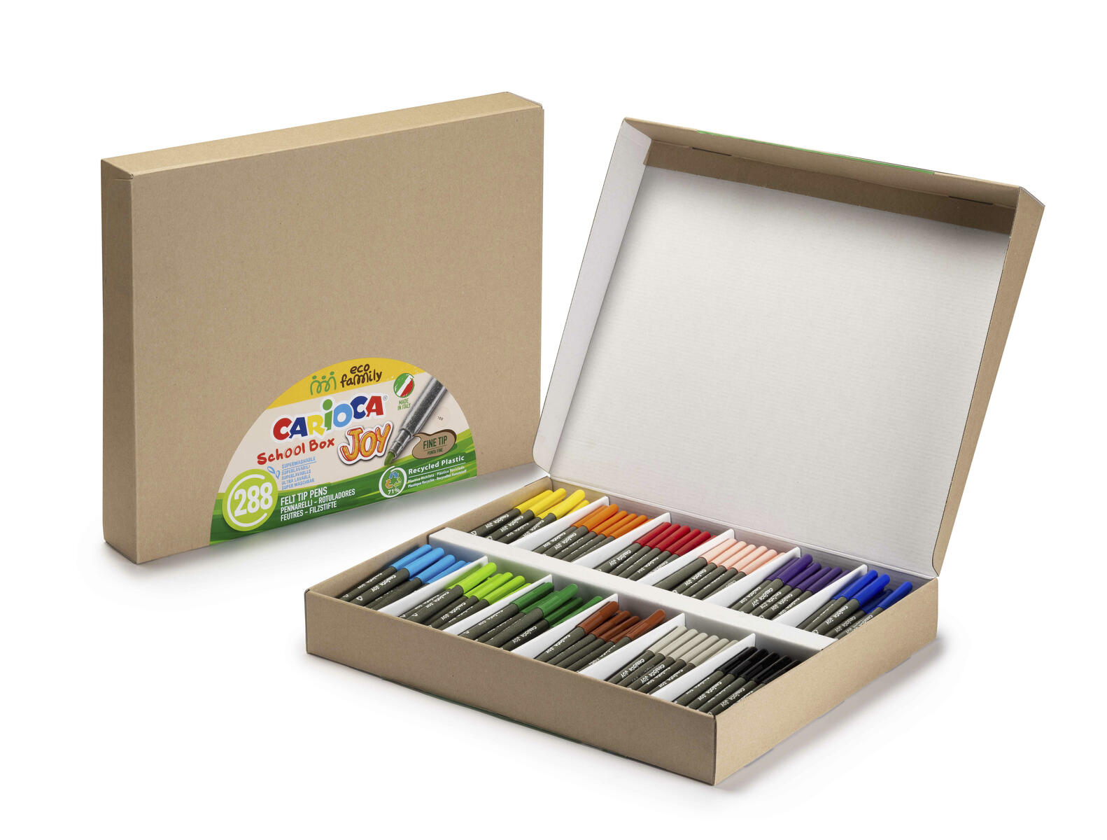 288 st/fp. Fiberpennor i klara färger med pennkropp tillverkad av 71 % återvunnen plast. PVC-fri. Ventilerad huv och säkrad spets. Bläcket kan tvättas bort från kläder, men skydda alltid underlag och textilier. 24 pennor av varje färg. Ingår: gul, orange, röd, lila, ljusblå, blå, ljusgrön, grön, rosa, brun, grå och svart. Längd 140 mm. Spetsbredd 2,8 mm. Från 3 år.