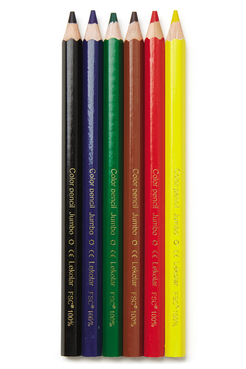 6 st/fp. Hexagonala färgpennor av hög kvalitet och med god täckförmåga. Hellimmat färgstift. Ingår gul, röd, blå, grön, brun och svart. Vässas i pennformerare som klarar upp till ø 12 mm. FSC-märkta. PVC-fri.
