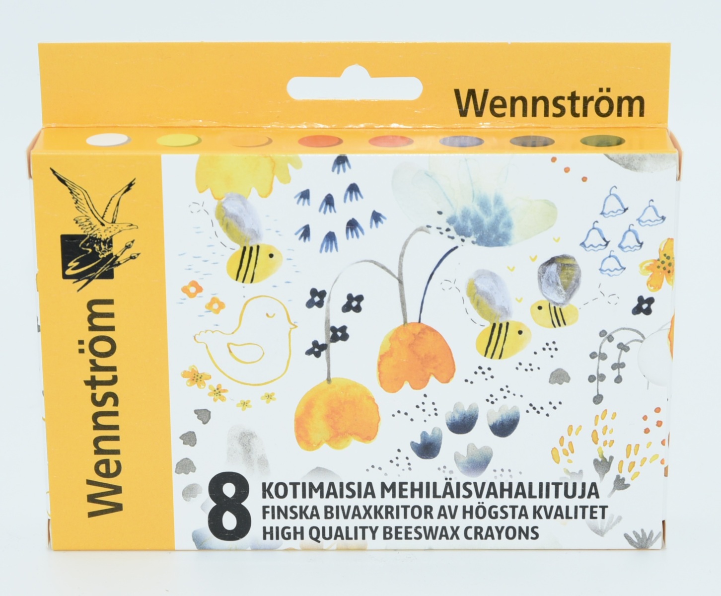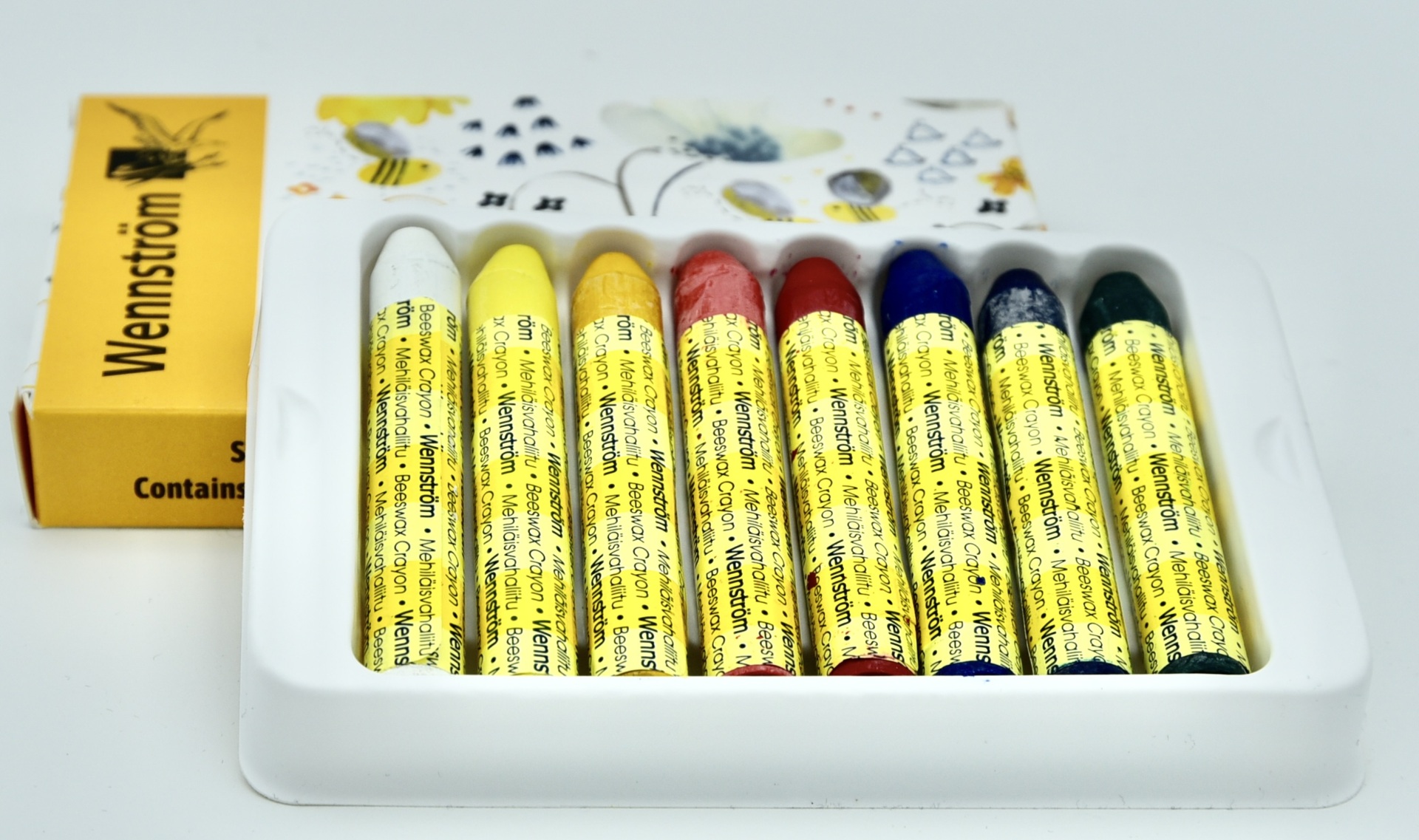8 st/fp. Skyddspapper på kritorna. Färgen är vatten- och ljusbeständig. Innehåller renat bivax. Kan användas på papper, kartong, trä, glas, plast, gummi och metall. Mått: längd 80 mm, ø 12 mm. PVC-fri.