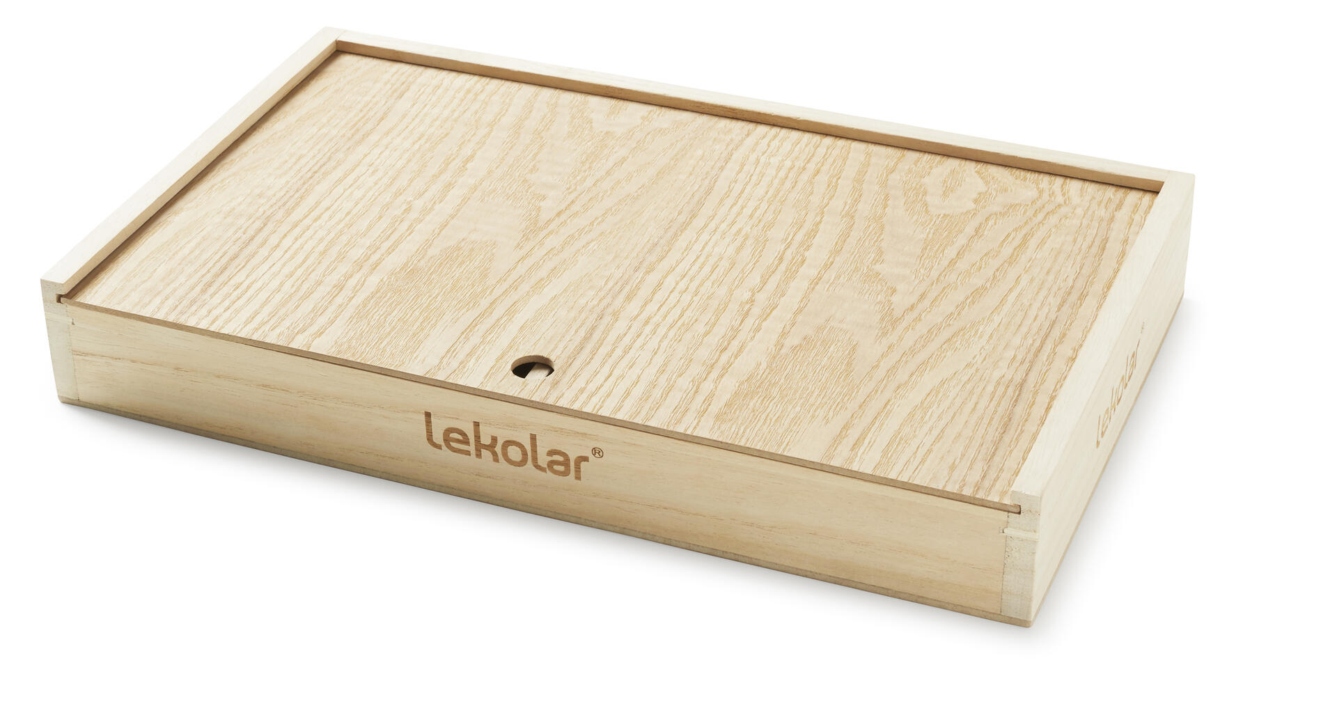 Förvaringslåda i trä som passar färgpennor som är max 180 mm långa. Fungerar även som mobillåda i skolan. Lådan stängs med lock som skjuts in i spår. Mått: L385xB300xH45 mm. Mått på facken L180xB420xH30 mm. Pennor ingår inte. Tillverkad av FSC certifierad björk.