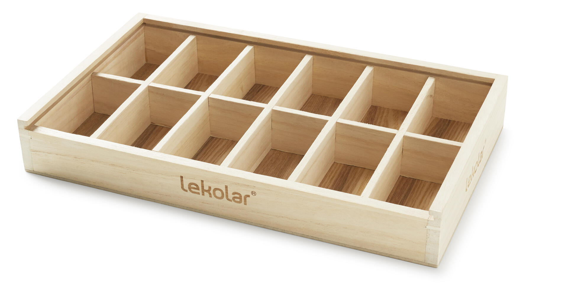 Förvaringslåda i trä som passar färgkritor som är max 105 mm långa. Fungerar även som mobillåda i skolan. Lådan stängs med lock som skjuts in i spår. Mått L220xB360xH50 mm. Mått på facken L100xB52xH40 mm. Kritor ingår ej. Tillverkad av FSC certifierad björk.
