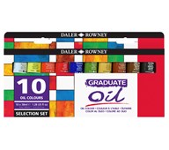 10x38 ml/fp. Oljefärger på tub, lätta att använda och blanda. Av märke Daler-Rowney. Torkar till en lågblank satinglans efter 4-5 dagar. Innehåller: titanvit, citrongul, primärröd, crimsonröd, ultramarinblå, hooker's grön, gulockra, bränd sienna, bränd umbra och svart.