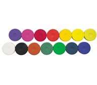 72 st/fp, ø 44 mm. Tjocklek 14 mm. Vattenlöslig och blandbar täckfärg med god täckförmåga. Kan användas både vid täckande och laserande målning. Ett klassrumsset som innehåller 6 st av citrongult, klargult, rött, mörkrött, cerise, klarblått, mörkblått, klargrönt, mörkgrönt, brunt, svart och vitt. PVC-fri.