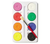 Plastpalett med 12 färgblock Mini ø 30 mm i klargult, rött, mörkrött, cerise, violett, klarblått, mörkblått, klargrönt, mörkgrönt, brunt, svart och vitt. Pensel ingår. PVC-fri.