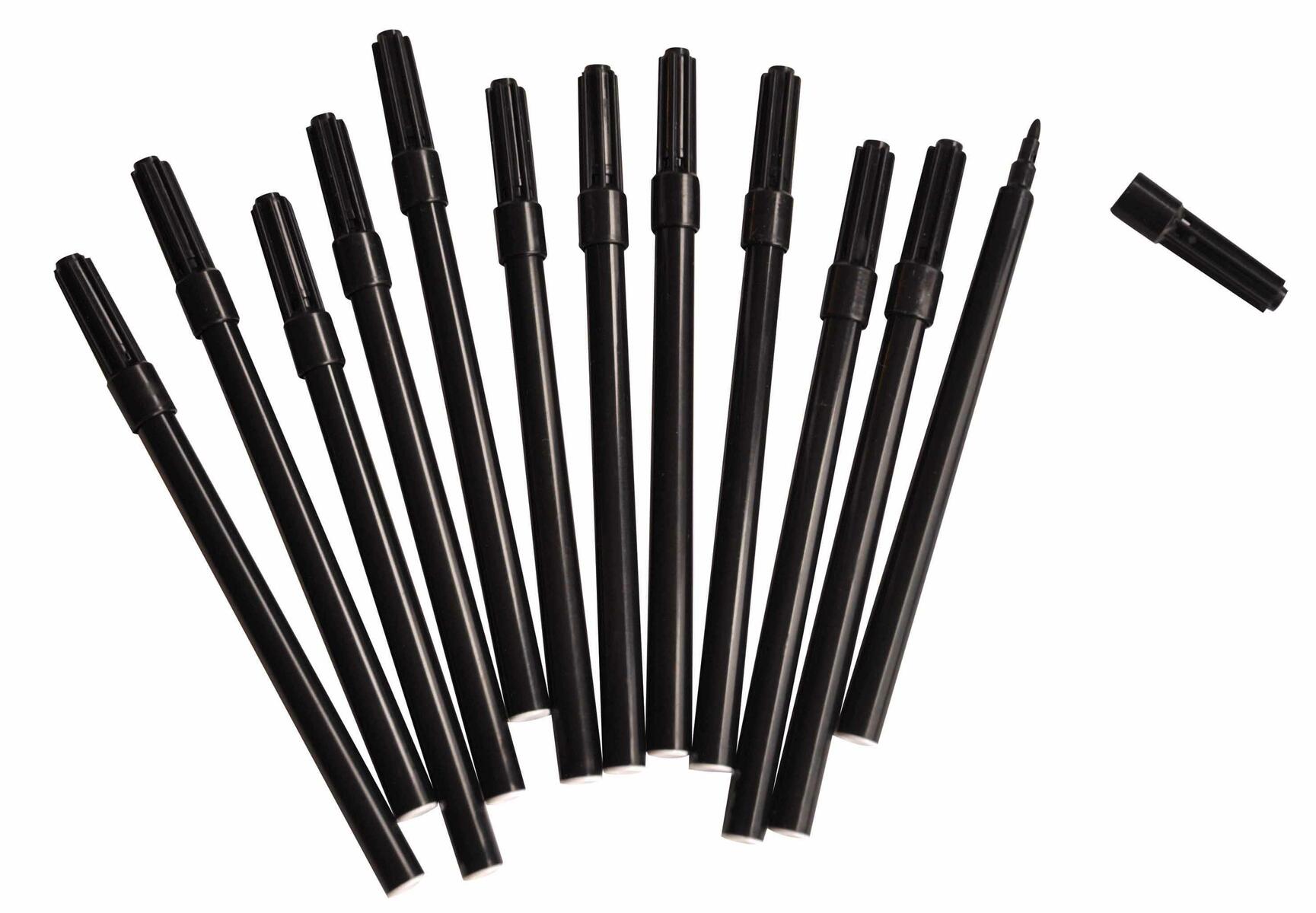 12 st svarta pennor/ask. Fiberpennor från Berol av hög kvalitet. Tålig, bred och rundad spets. Flödigt bläck som passar färgläggning av lite större ytor och inte blöder igenom ritpapper. Ventilerad huv och pennkropp av plast. Pennan kan ligga utan huv i upp till två veckor utan att torka ut. Bläcket kan tvättas bort från kläder, men skydda alltid underlag och textilier vid användande. Linjebredd 1,2 mm. Längd 135 mm. ø 11 mm. CE-märkta. PVC-fri. Från 3 år.