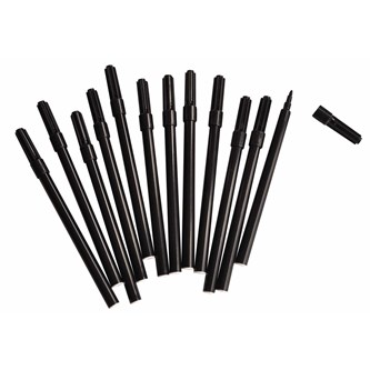 12 st svarta pennor/ask. Fiberpennor från Berol av hög kvalitet. Tålig, bred och rundad spets. Flödigt bläck som passar färgläggning av lite större ytor och inte blöder igenom ritpapper. Ventilerad huv och pennkropp av plast. Pennan kan ligga utan huv i upp till två veckor utan att torka ut. Bläcket kan tvättas bort från kläder, men skydda alltid underlag och textilier vid användande. Linjebredd 0,6 mm. Längd 135 mm. ø 11 mm. CE-märkta. PVC-fri. Från 3 år.