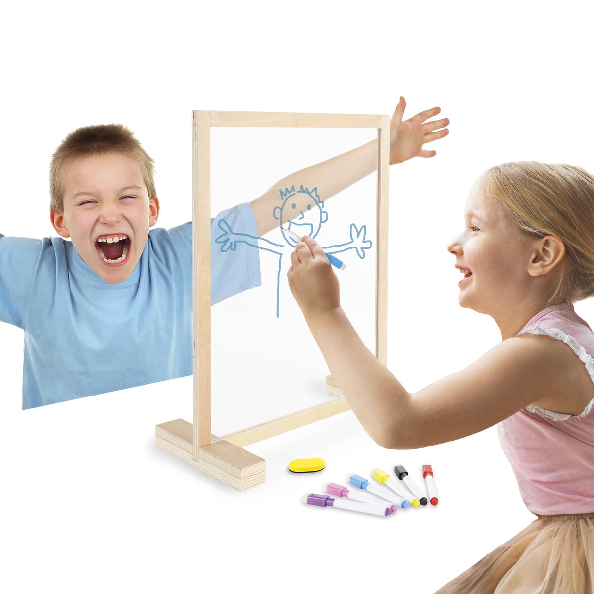 Dubbelsidigt golvstaffli på stadig bas. Arbetsyta av akrylglas. Papper eller plastfilm fästs enkelt på glaset med maskeringstejp eller vid stommen. Det går bra attt använda våra fönsterfärger, målas först på plastfilm. Motivet kan efter torkning tas loss från plastfilmen och fästas på plana ytor, såsom fönster och glas. Fäster ej permanent, utan kan flyttas om och om igen. I basen finns ett grunt fack på varje sida. Handtag på långsidorna. Mått: B64xH106xD40 cm, arbetsyta B55xH98 cm, fackdjup 8 cm. Totalvikt 10 kg. Levereras omonterat. Monteringsanvisning medföljer. Tillverkat av FSC-certifierat trä. Stomme av massiv bok, skivor i plywood lackad med vattenbaserat lack. Rengör med fuktig trasa och milt diskmedel innan färg har torkat. CE-märkt. PVC-fri.
