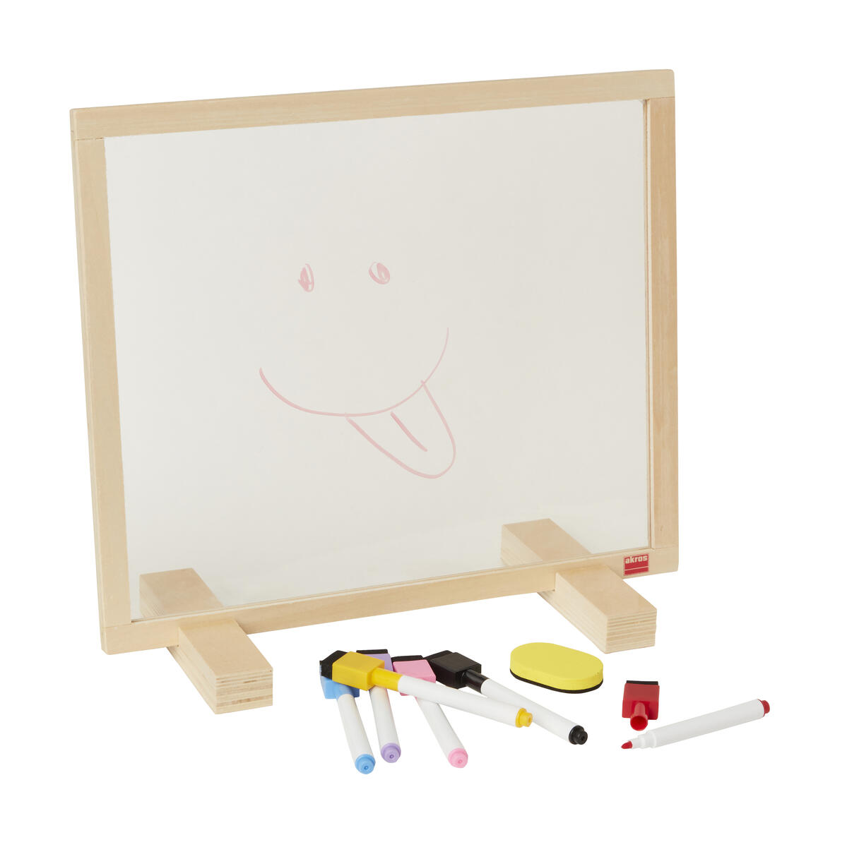 Multisensorisk bricka för att utveckla öga-handkoordinationen och att öva på att forma bokstäver och former. Innehåller bricka för sand, platta med en magnetisk whiteboard på ena sidan och griffeltavla på andra, 0,4 kg sand, en whiteboardpenna, tre griffelkritor, en sudd och ett verktyg för att platta ut sanden. Mått 30x30 cm. PVC-fri.