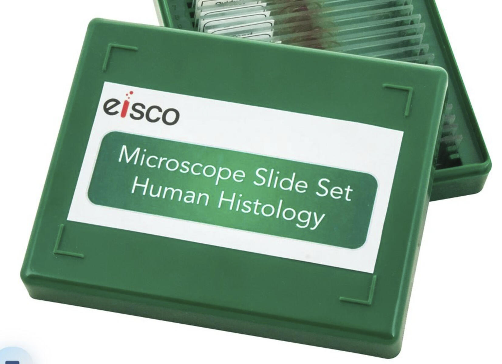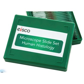 Set med mikropreparat från människa, t.ex. hårfollikel (hudsnitt), svettkörtel (hudsnitt), artär och ven, tvärstrimmig muskel, nervceller/utstrykning, ryggmärg, synaps, smaksinnesceller, magsäcksvägg, njure med blodkärl, tunntarm och lunga med blodkärl.
