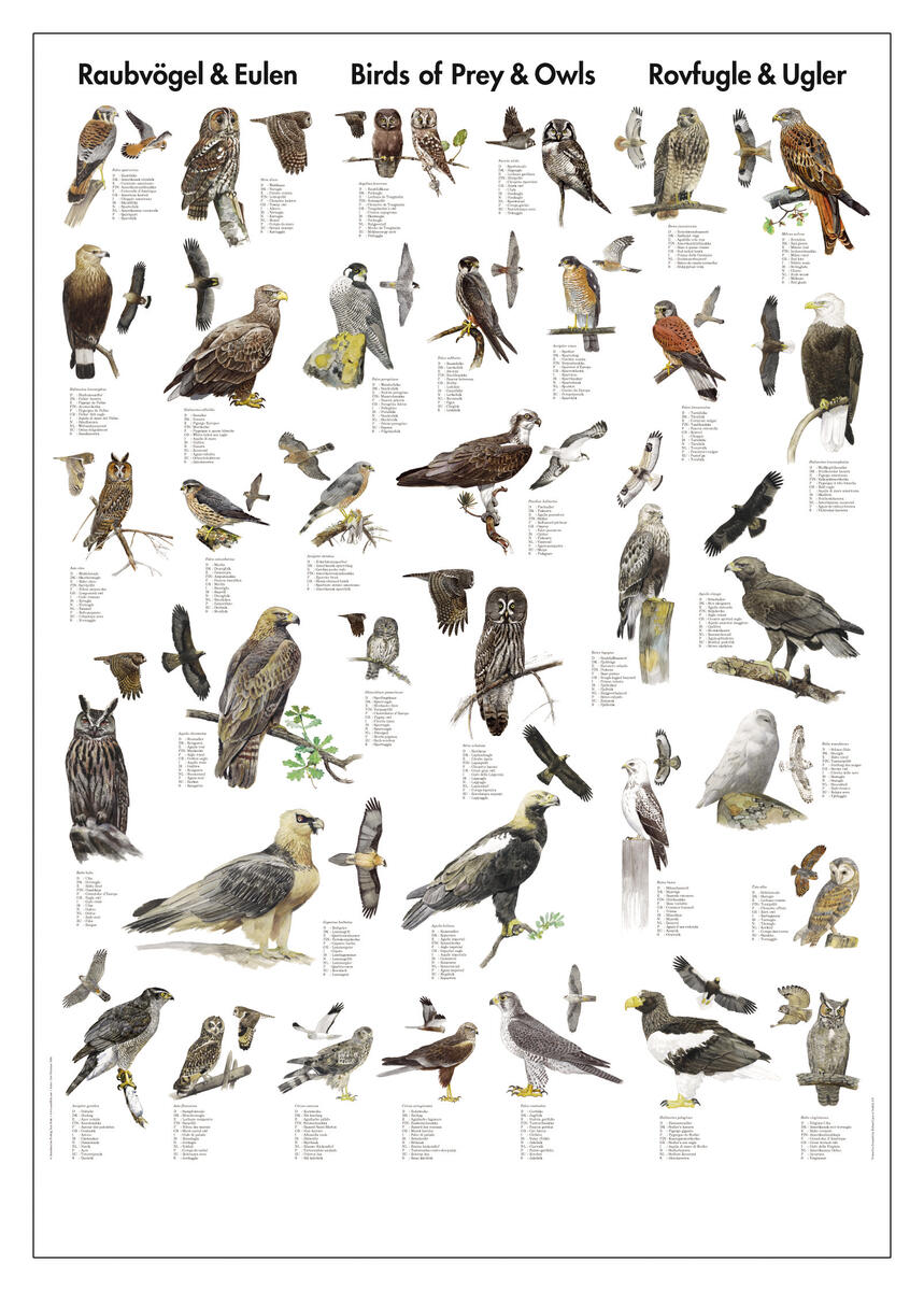 Visar 32 av de vanligaste fåglarna. Mått: 70x100 cm. Namnen på fåglarna på 14 språk: danska, engelska, tyska, spanska, franska, finska, italienska, isländska, norska, holländska, portugisiska, ryska, svenska och latin.