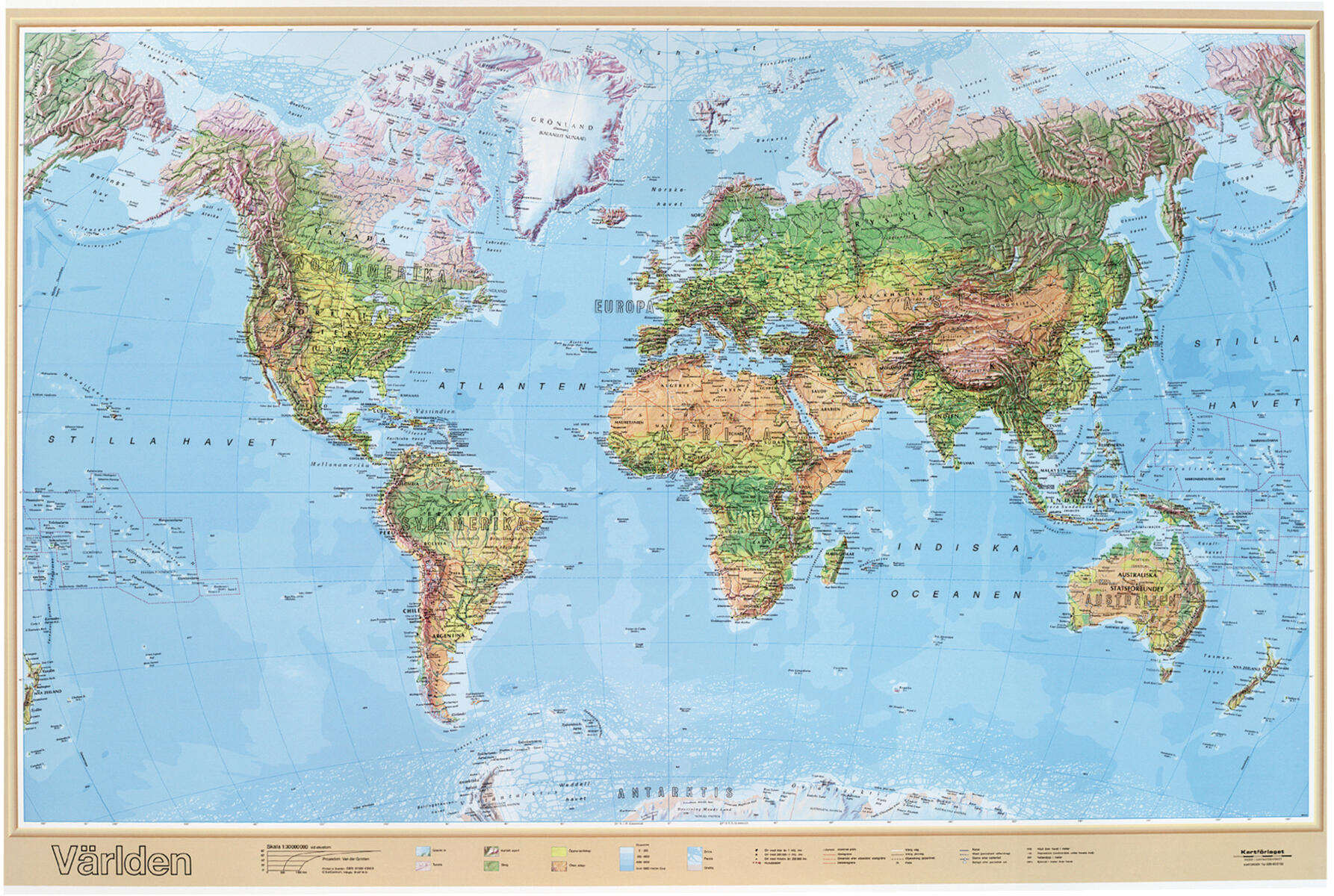 Skala 1:1,3 milj. Mått: 55x123 cm. Av papp. Levereras rullad i rör. Färgerna visar olika höjdskikt och gör bland annat Sveriges fjällkedja tydlig. Större vägar, järnvägar och städer är markerade. Sveriges län finns utsatta och namngivna.