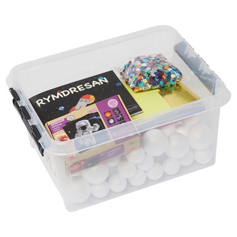 Utforska planeterna på ett ljusbord i ett mörkt rum. Innehåller 10 stora, transparenta planeter och en komet, satellit, astronaut, meteorit m.m. Den största planeten har ø 40 och den minsta 9 cm. Av PP. PVC-fri. Från 3 år.
