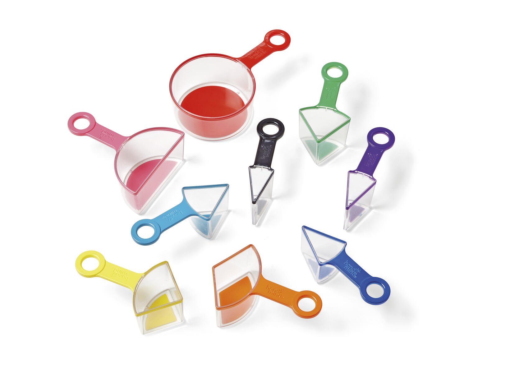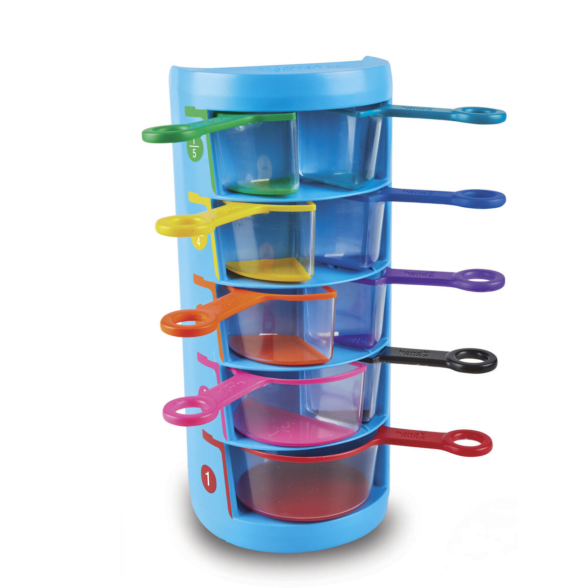 Träna bråkdelar, volym och kapacitet med detta färgkodade set måttkoppar. Smidig förvaring i basen när måtten inte används. Innehåller 9 mått och 1 förvaringsask. Av plast, PVC-fri. Från 3 år.