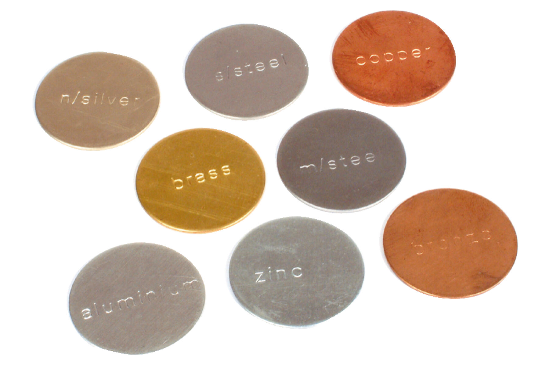 8 st metallplattor bestående av brons, mässing, stål, nickel, rostfritt stål, zink, koppar och aluminium. Idealiska för klassifikationer och experiment.