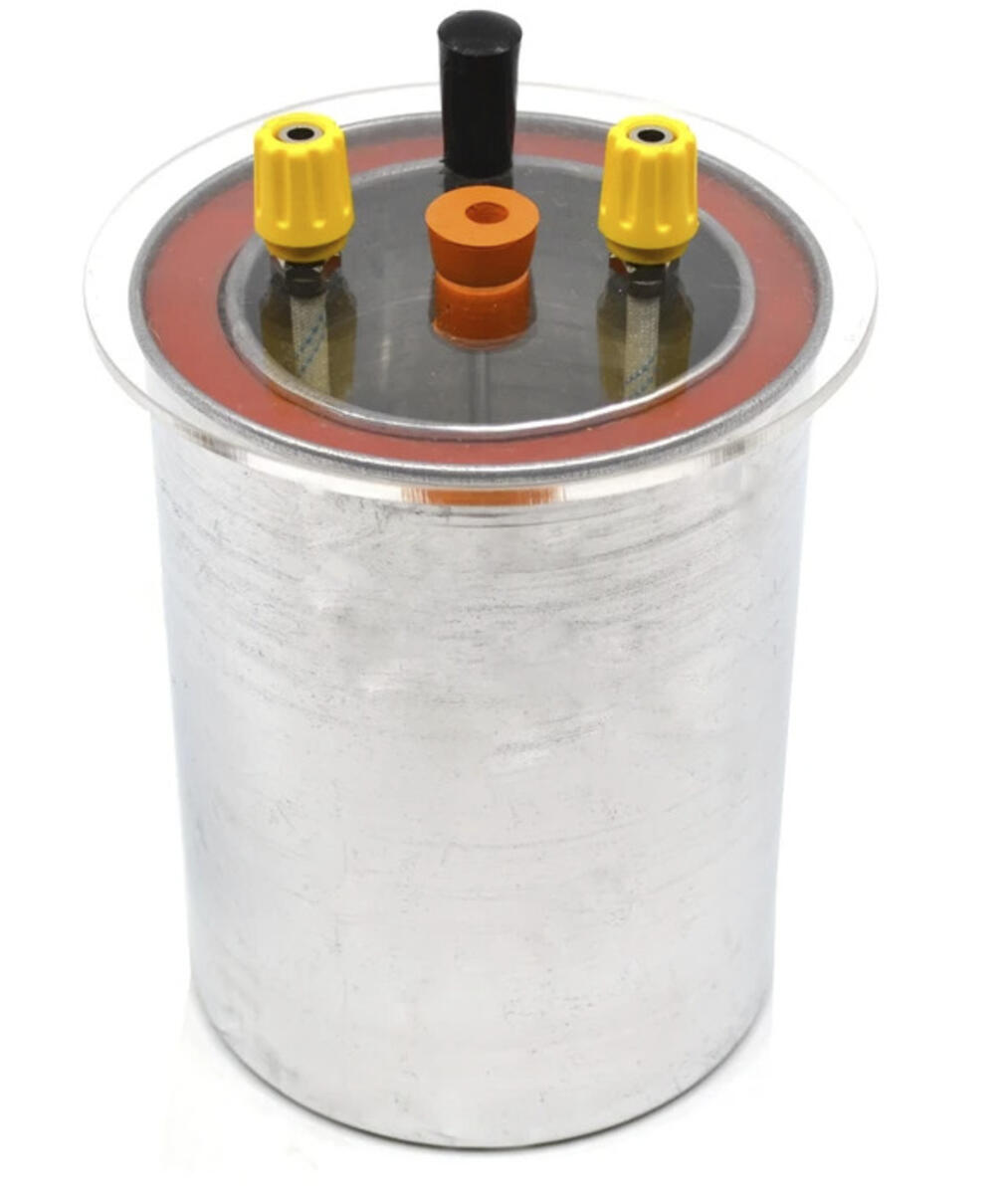 Elektrisk kalorimeter med dubbla väggar. Inre kärl 250 ml i aluminium. Yttre kärl 900 ml. Genomskinligt skyddshölje med två terminaler.