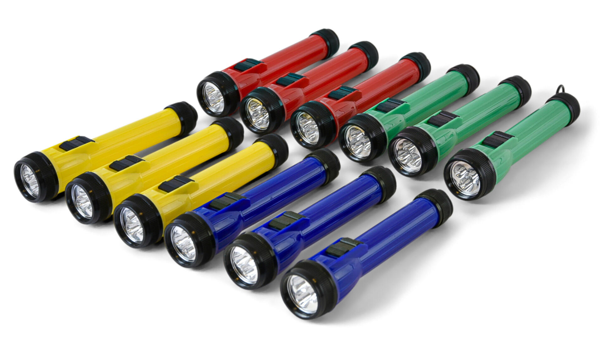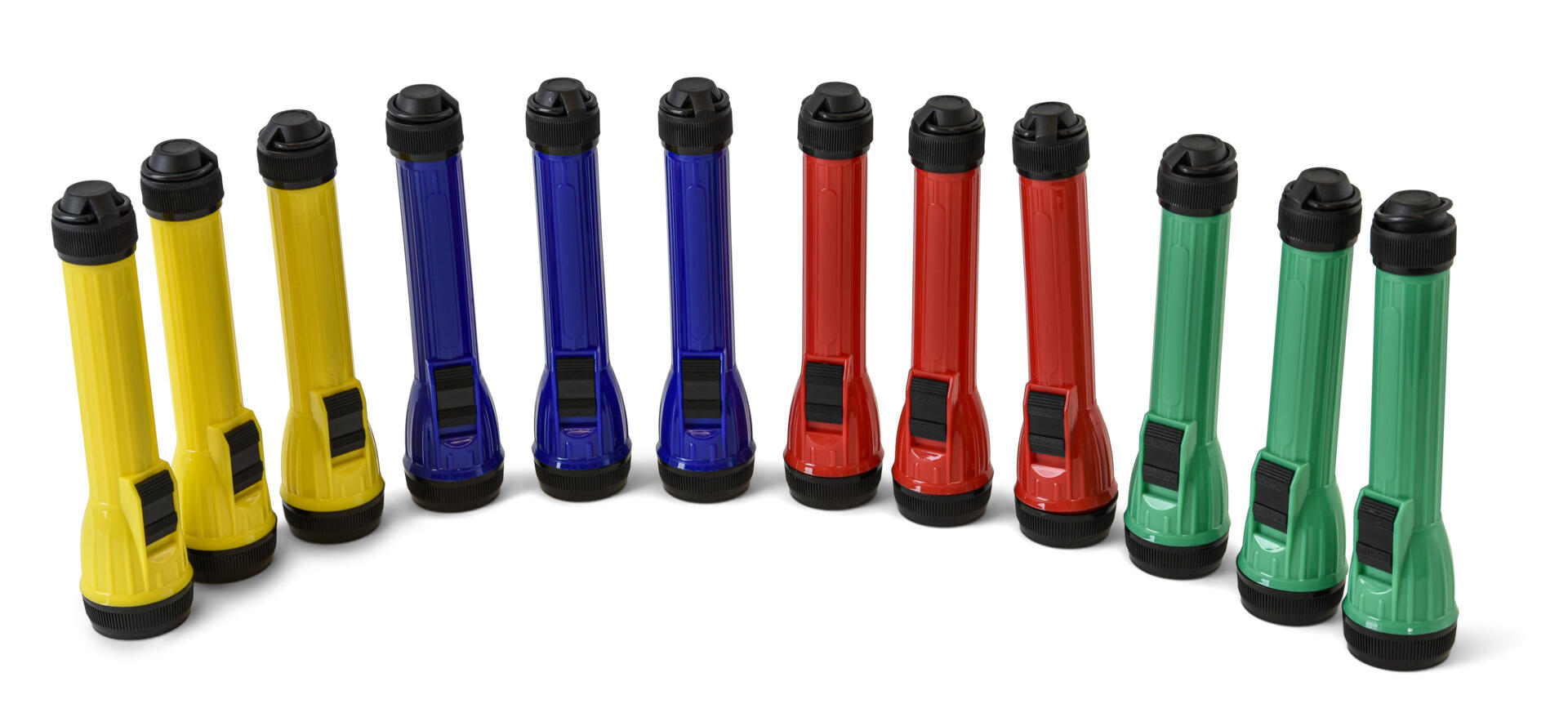 12 st/fp. Små handhållna LED-ficklampor för klassrumsexperiment. Innehåller 3 röda, 3 blå, 3 gröna och 3 gula. Mått: 16x3 cm. Drivs med 2 st AA-batterier, ingår ej.
