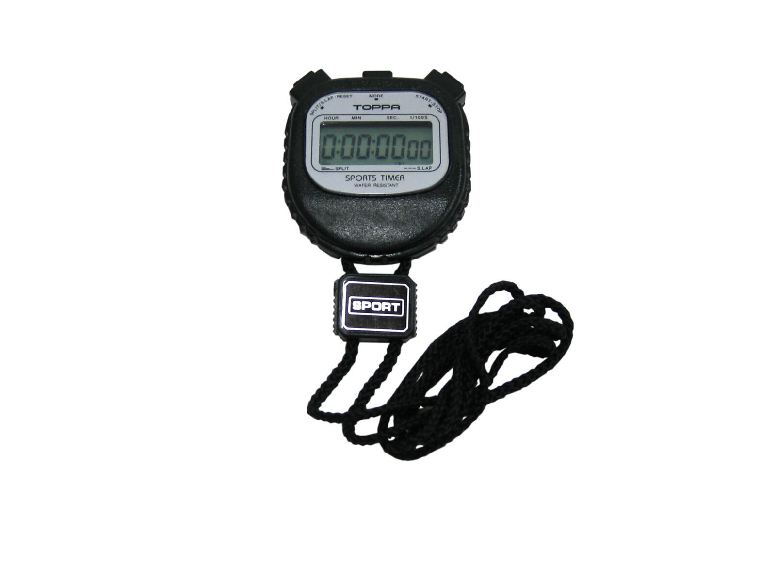 Ett robust, vattenskyddat tidtagarur med sjusiffrig display. Med funktionerna start, stop, reset & split, normaltid och datum. 1/100 s. Komplett med batteri CR2032 och halsrem.