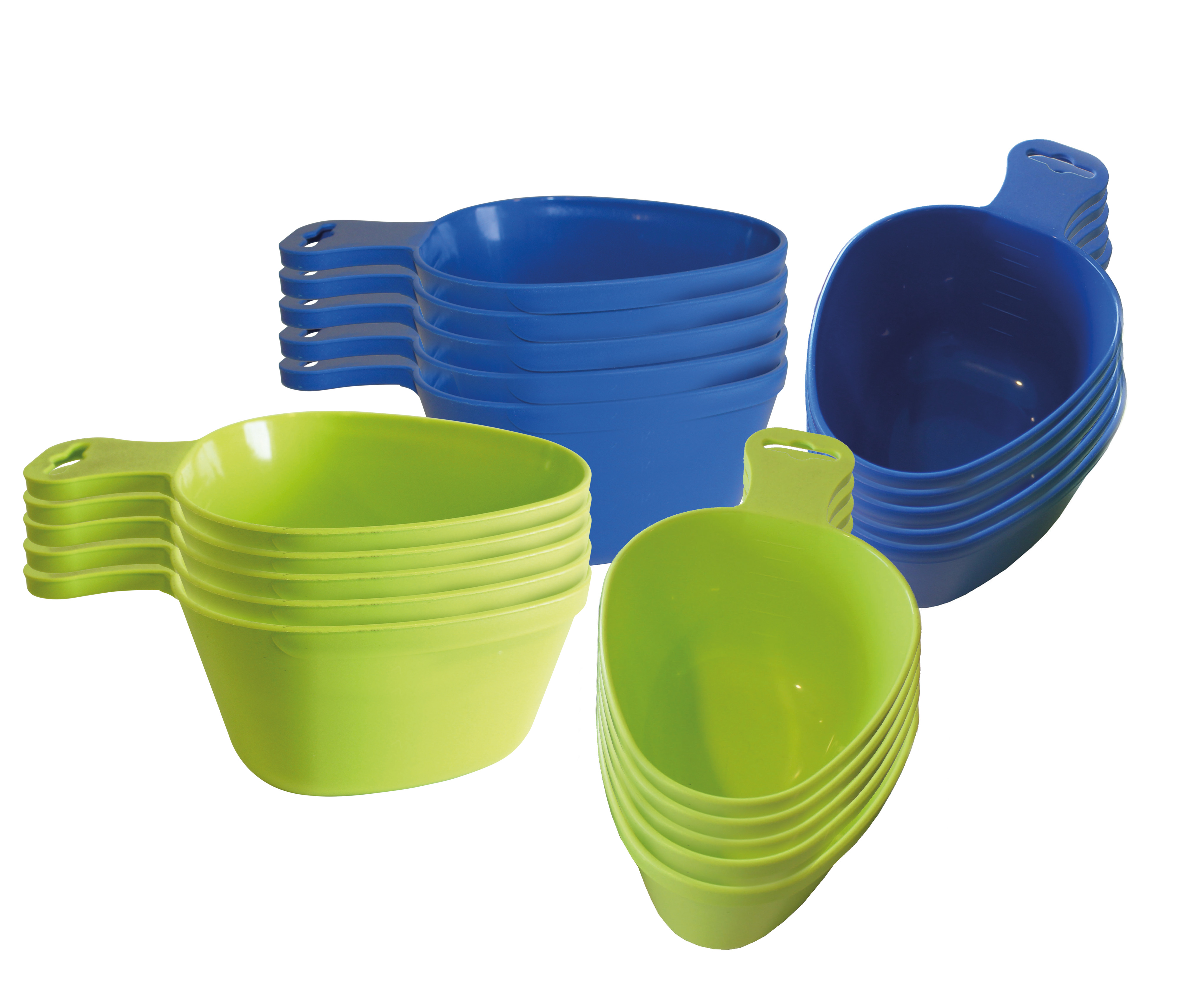 10 st/fp. En robust matkåsa/vattenskopa av 100 % förnybart material utan färgtillsatser, livsmedelsgodkänd. Rymmer 8 dl. Lämplig för både inomhus- och utomhusbruk. PE-baserat på sockerrör med samma hållbarhet och egenskaper som övriga plastprodukter. Mått: 30x16,5x8 cm. Diskas i övre delen av diskmaskinen.
