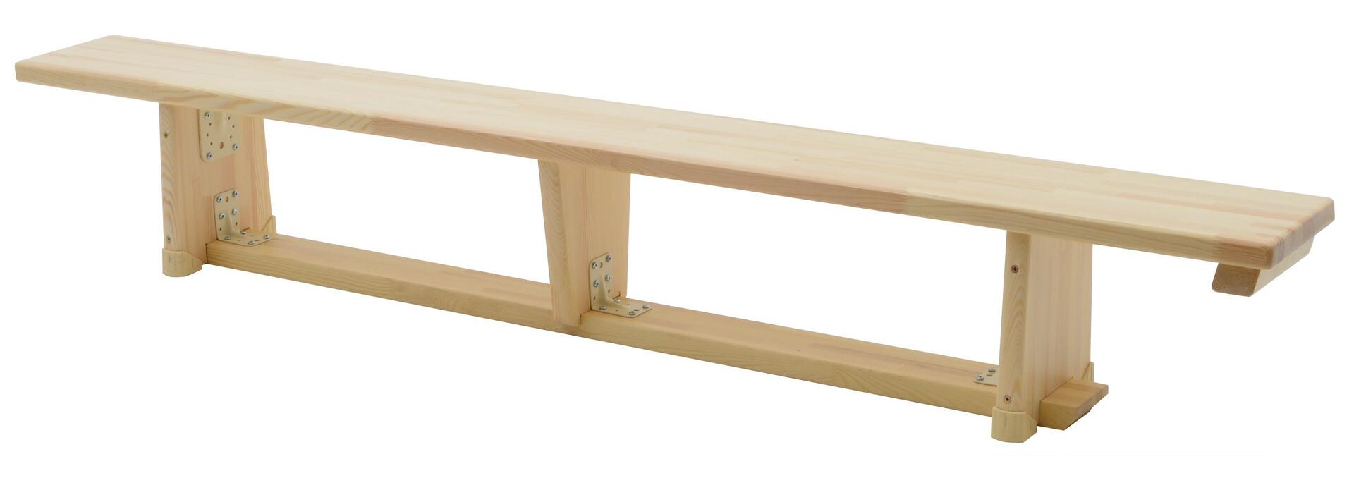 En gymnastikbänk av klarlackerad fingerskarvad furu med en ”klack” undertill för att kunna fästas i ribbstolar eller pallplintar. Anti-slip för att inte glida på underlaget. L200xB22xH30 cm. Balansskivan undertill är 10 cm bred. Godkänd enl. Standard PN-N-97063:1996 and PN-EN 913:2008.