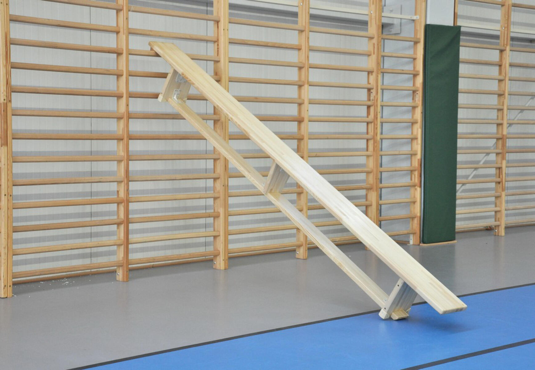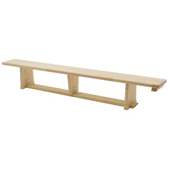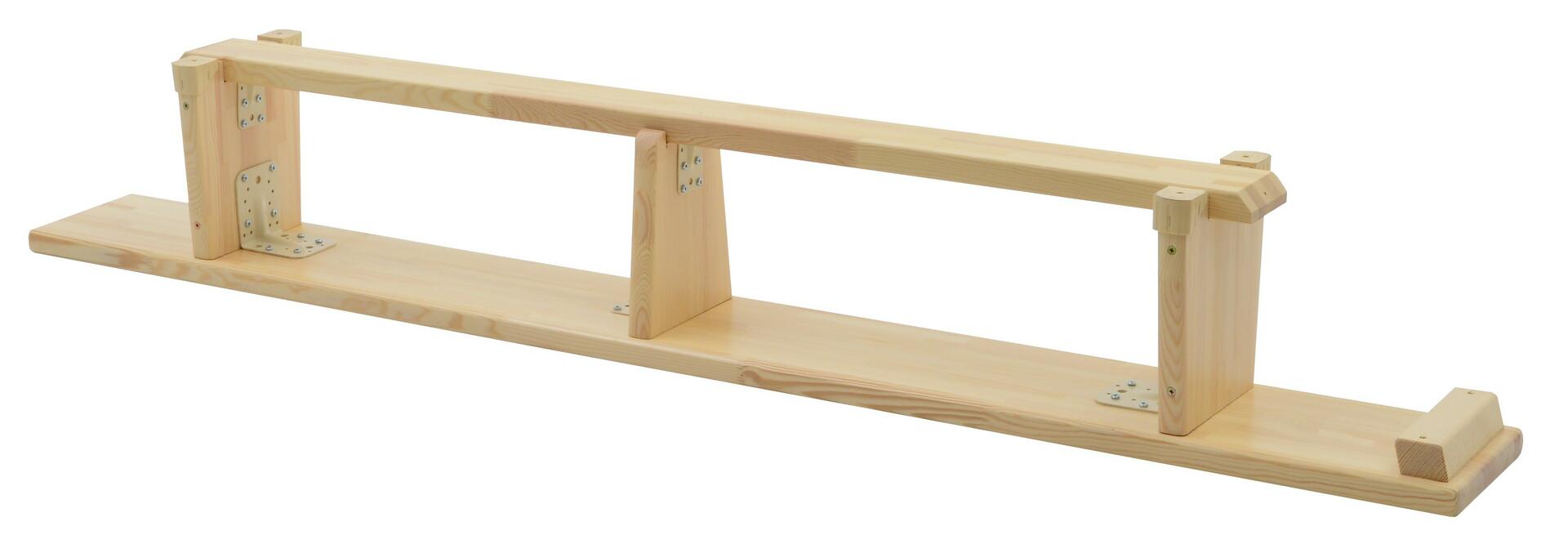 En gymnastikbänk av fingerskarvad furu med en ”klack” undertill för att kunna fästas i ribbstolar eller pallplintar. Anti-slip för att inte glida på underlaget. L300xB22xH30 cm. Balansskivan undertill är 10 cm bred. Godkänd enl. Standard PN-N-97063:1996 and PN-EN 913:2008.