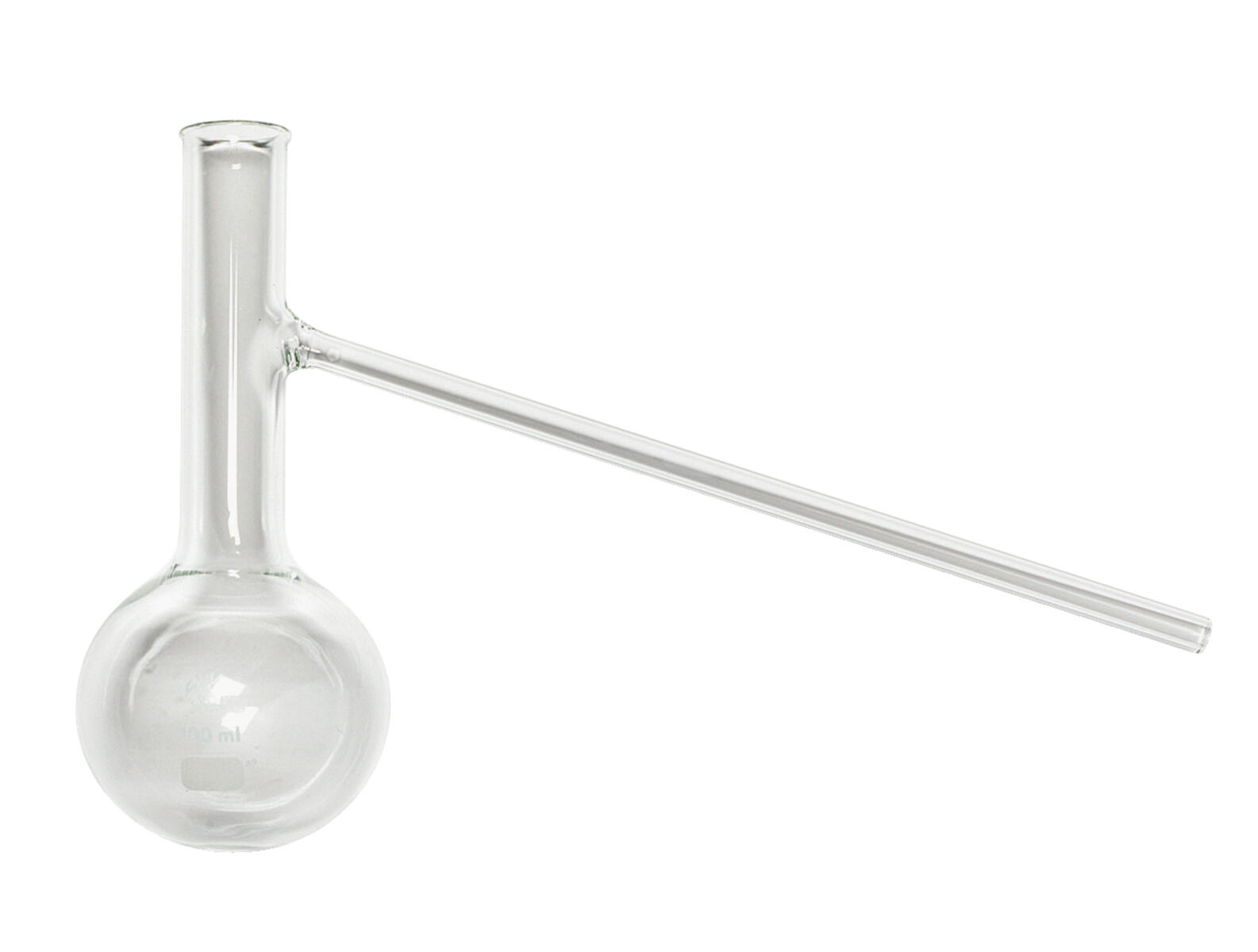 250 ml, med sidorör. Mått: höjd 20 cm, flaskhals ytterdiameter 3,5 cm och innerdiameter ca 3,2 cm. Sidorör: längd 20 cm, ytterdiameter 0,8 cm och innerdiameter ca 0,5 cm. Av borsilikatglas.