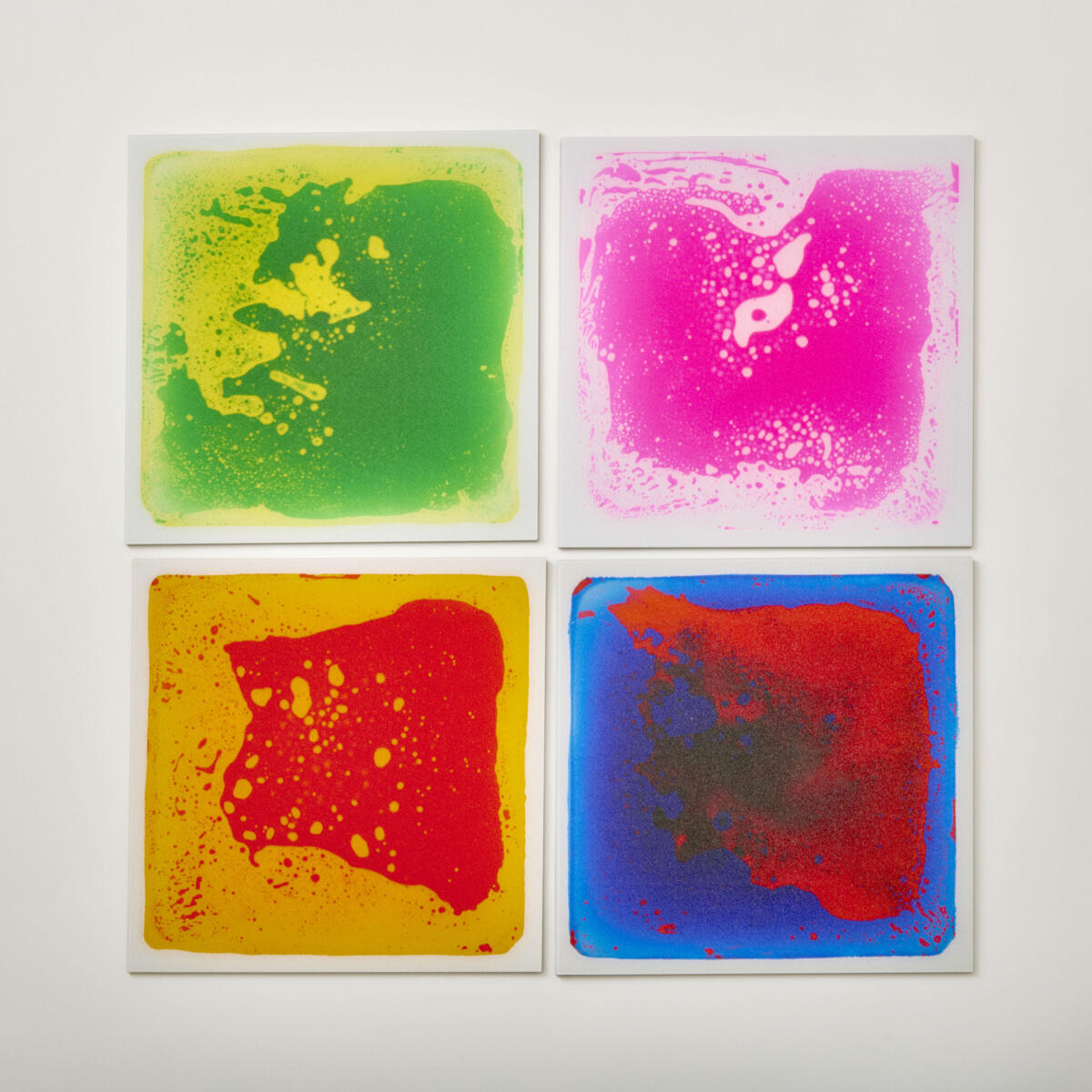 4 st/fp. En underbar och taktil upplevelse som uppmuntrar till rörelse och att upptäcka plattorna. De är fyllda av en flytande gel som vid tryck flyttar sig och skapar olika mönster. De tål att hoppas på och köras över med en rullstol eller lekbil. De fungerar även på ett bord där man kan trycka på dem med handen. Mått 30x30 cm.