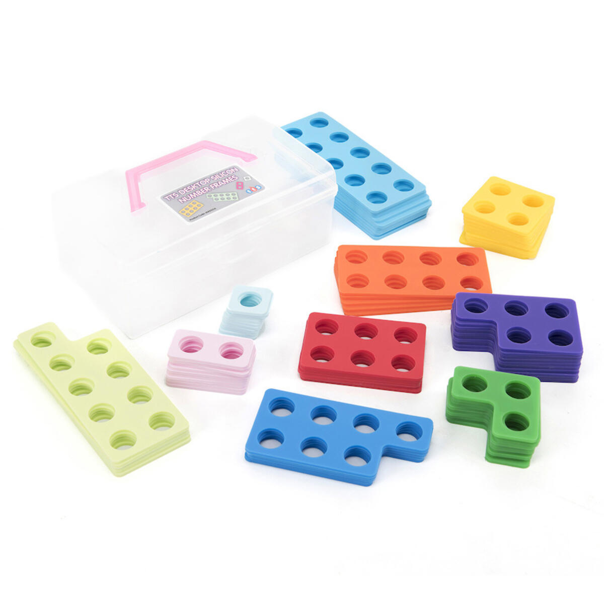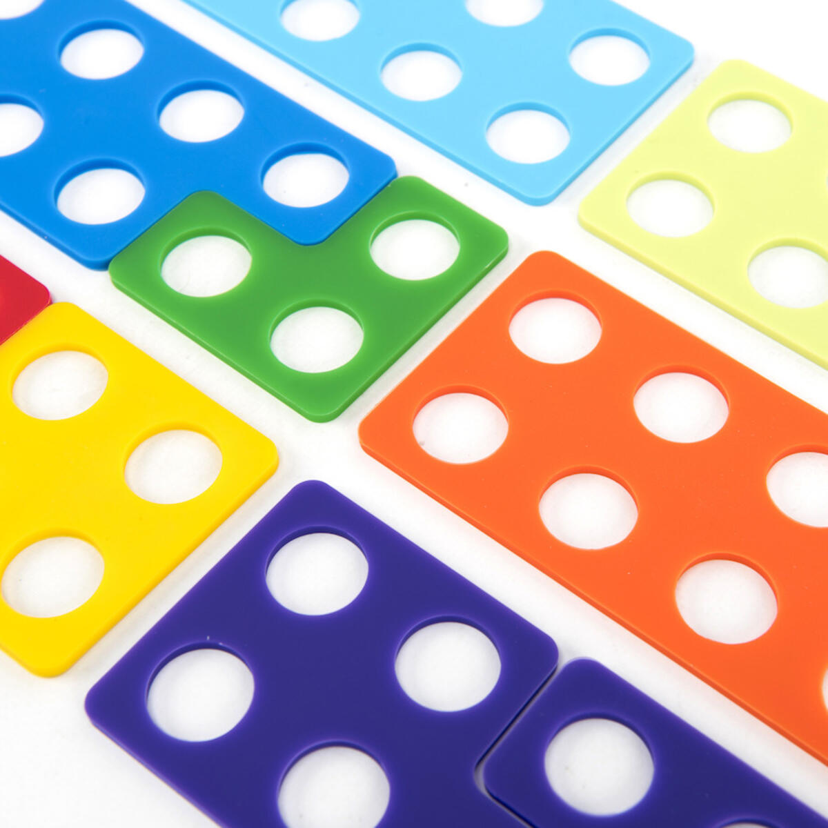 80 st/fp. Mångsidiga ramar för utveckling av matematiskt flyt och resonemang. Den visuella aspekten hjälper till att utveckla en praktisk förståelse av antal och stödjer utvecklingen av räkning och problemlösning. Passar bra att arbeta med både i grupp och enskilt. Träna på att räkna, känna igen tal, sekvensering och samband mellan olika antal. Måttexempel på minsta delen, 2,5x2,5 cm och största delen, 12,5x5 cm. Från 3 år.