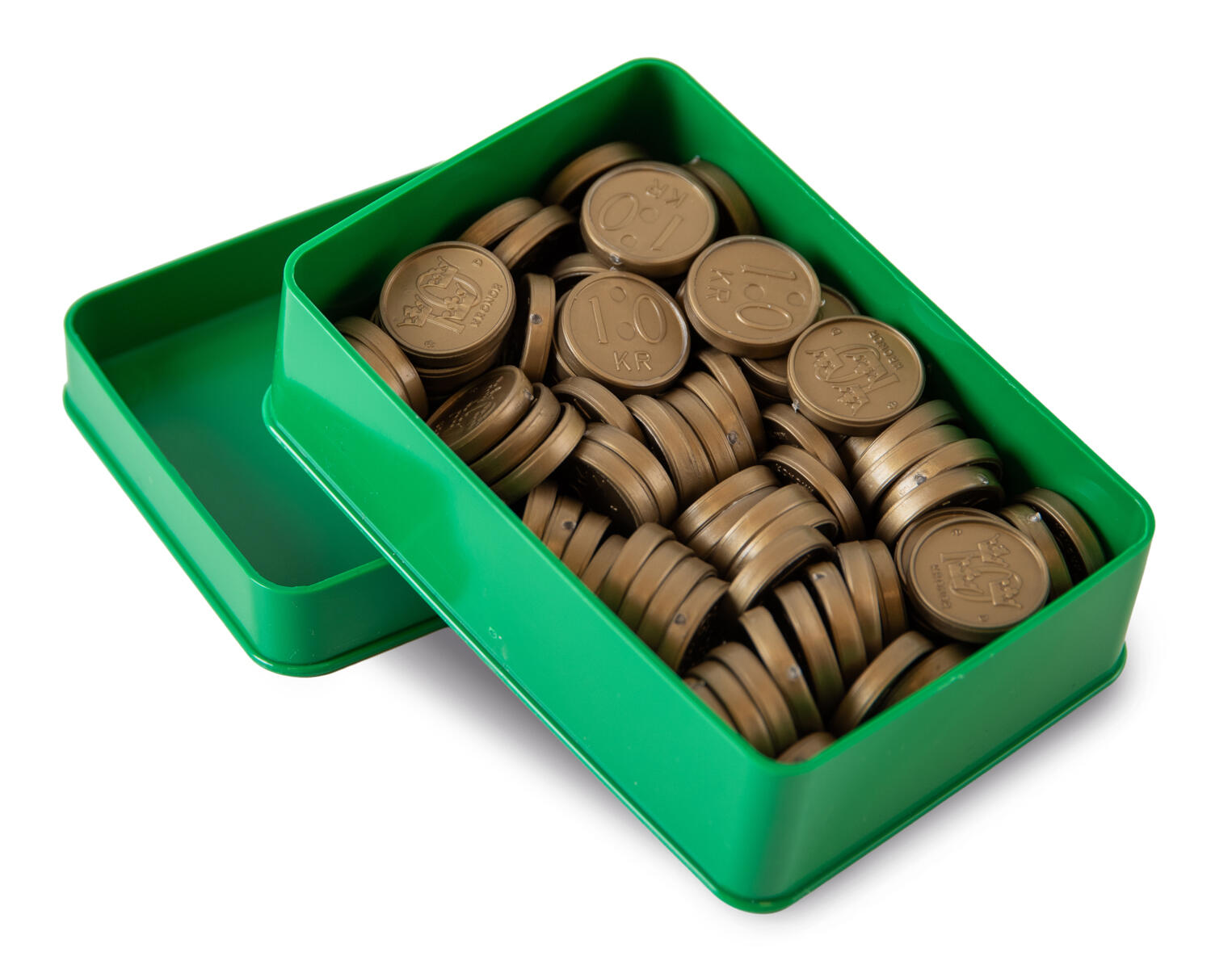 Set med svenska mynt och sedlar. Mynten är gjorda i plast. Samma diameter som riktiga mynt, men med större tjocklek. Sedlarna i fyrfärg med tryck på båda sidor. 80 % av naturlig storlek. Innehåller 100 st av varje valör 1 , 2, 5, 10 , 20 , 50, 100, 200, 500 och 1000 kronor. Svanenmärkt, licensnummer 3041 0146. PVC-fri. Från 3 år.