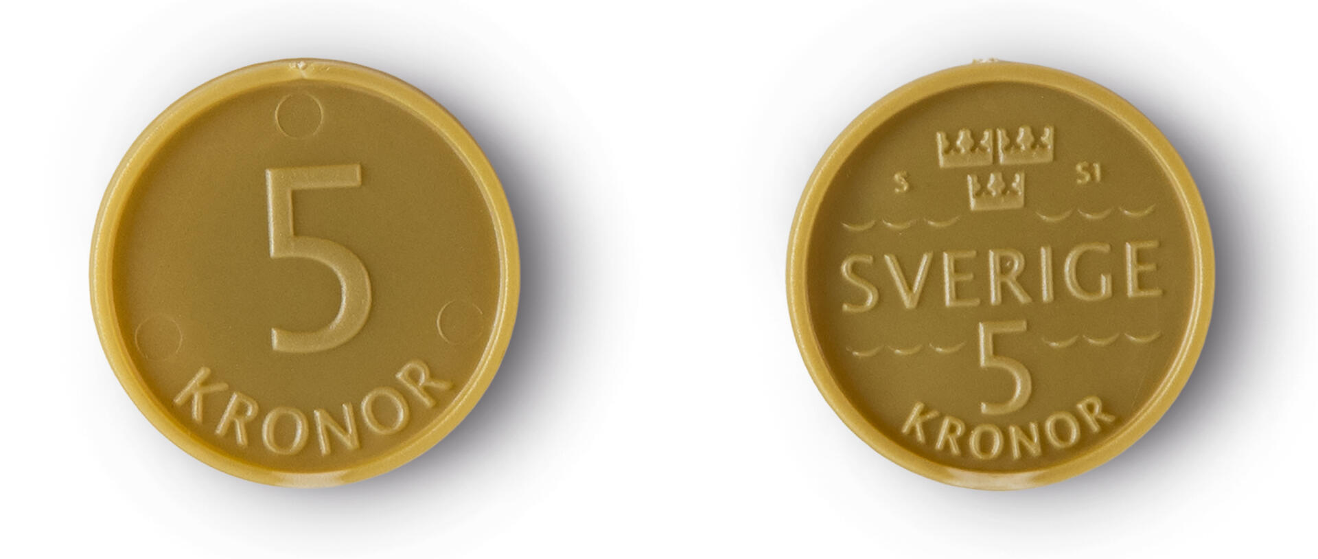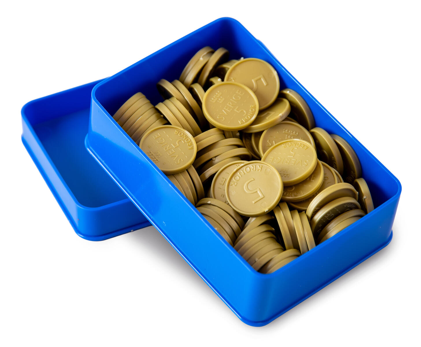 Set med svenska mynt och sedlar. Mynten är gjorda i plast. Samma diameter som riktiga mynt, men med större tjocklek. Sedlarna i fyrfärg med tryck på båda sidor. 80 % av naturlig storlek. Innehåller 100 st av varje valör 1 , 2, 5, 10 , 20 , 50, 100, 200, 500 och 1000 kronor. Svanenmärkt, licensnummer 3041 0146. PVC-fri. Från 3 år.