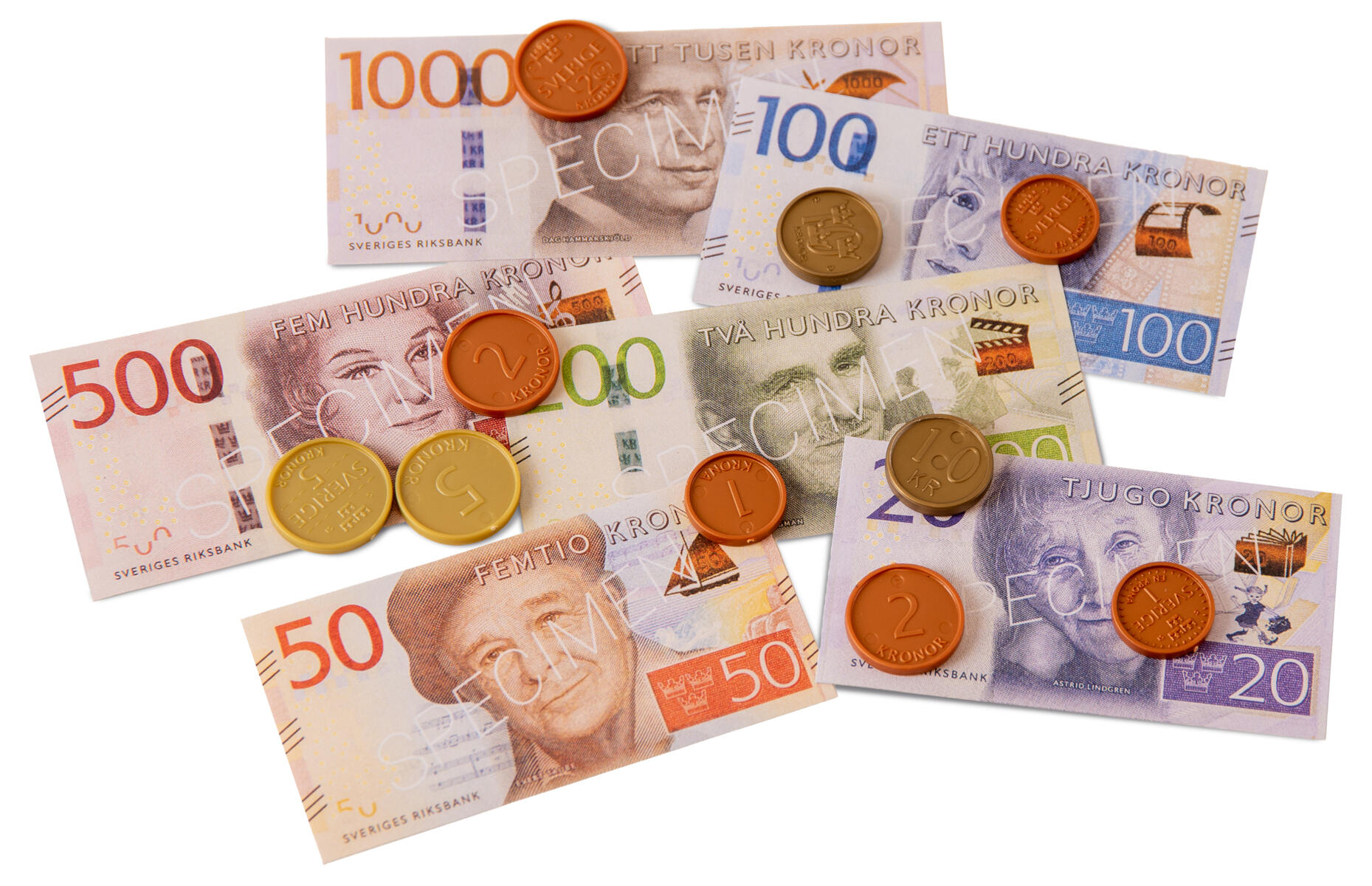 Set med svenska mynt och sedlar. Mynten är gjorda i plast. Samma diameter som riktiga mynt, men med större tjocklek. Sedlarna i fyrfärg med tryck på båda sidor. 80 % av naturlig storlek. Innehåller 100 st av varje valör 1 , 2, 5, 10 , 20 , 50, 100, 200, 500 och 1000 kronor. Svanenmärkt, licensnummer 3041 0146. PVC-fri. Från 3 år.