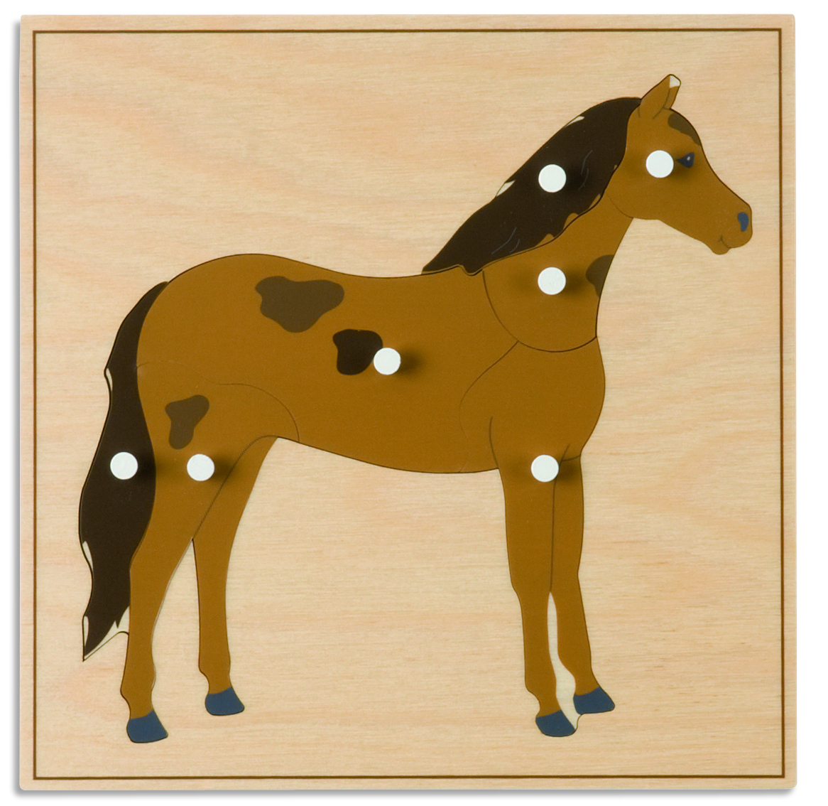 7 bitar. Träpussel i form av en häst. Varje pusselbit har en knopp. Utvecklar barnets intresse och kunskap kring zoologi. Lär ut hästens delar. Från 4 år.