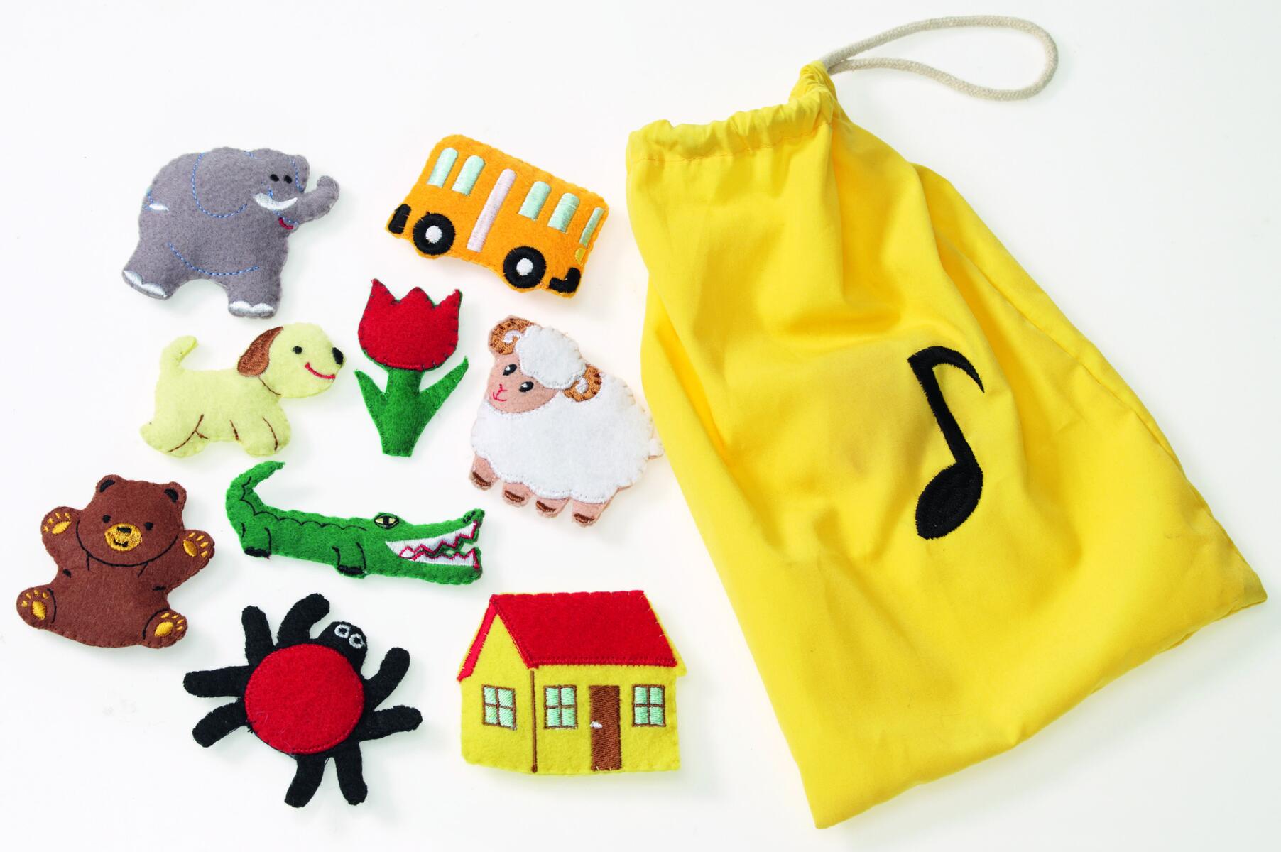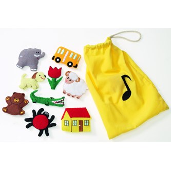 En påse med dragsko innehållande 10 olika mjuka figurer som kan användas till sångförslag. Barnen sticker ner handen i påsen och efter att ha tagit upp en figur försöker de komma på en sång som handlar om just detta djur eller sak. Påsen innehåller elefant, spindel, björn, hund, hus, lamm, katt, buss, blomma och krokodil. Med kardborre på baksidan om man vill sätta upp djuret på t.ex. en flanellograftavla. Mått på figurer ca 7 cm. Av polyester. PVC-fri.