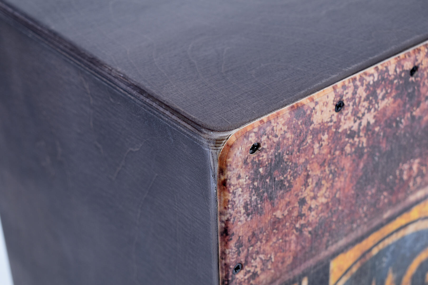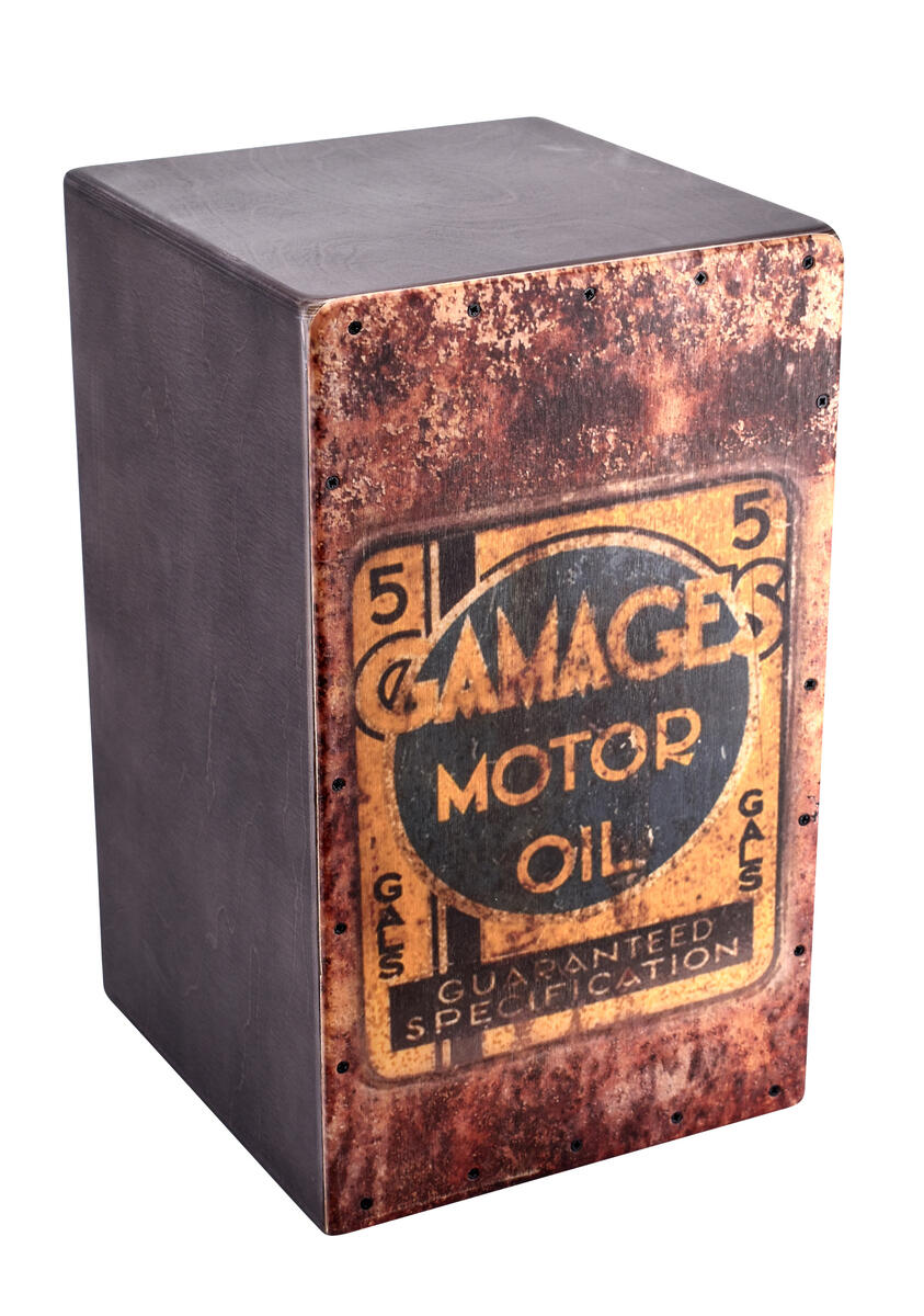 Tre instrument är gömda i den här unika uppfinningen: minicajon, trumma och bongo. Den kan spelas med fingrarna på framsidan som en cajon, och på baksidan som en bongo. Man kan även sjunga in i instrumentet genom ett av hålen och få fram ett saxofonliknande ljud. Mått: 12 cm.