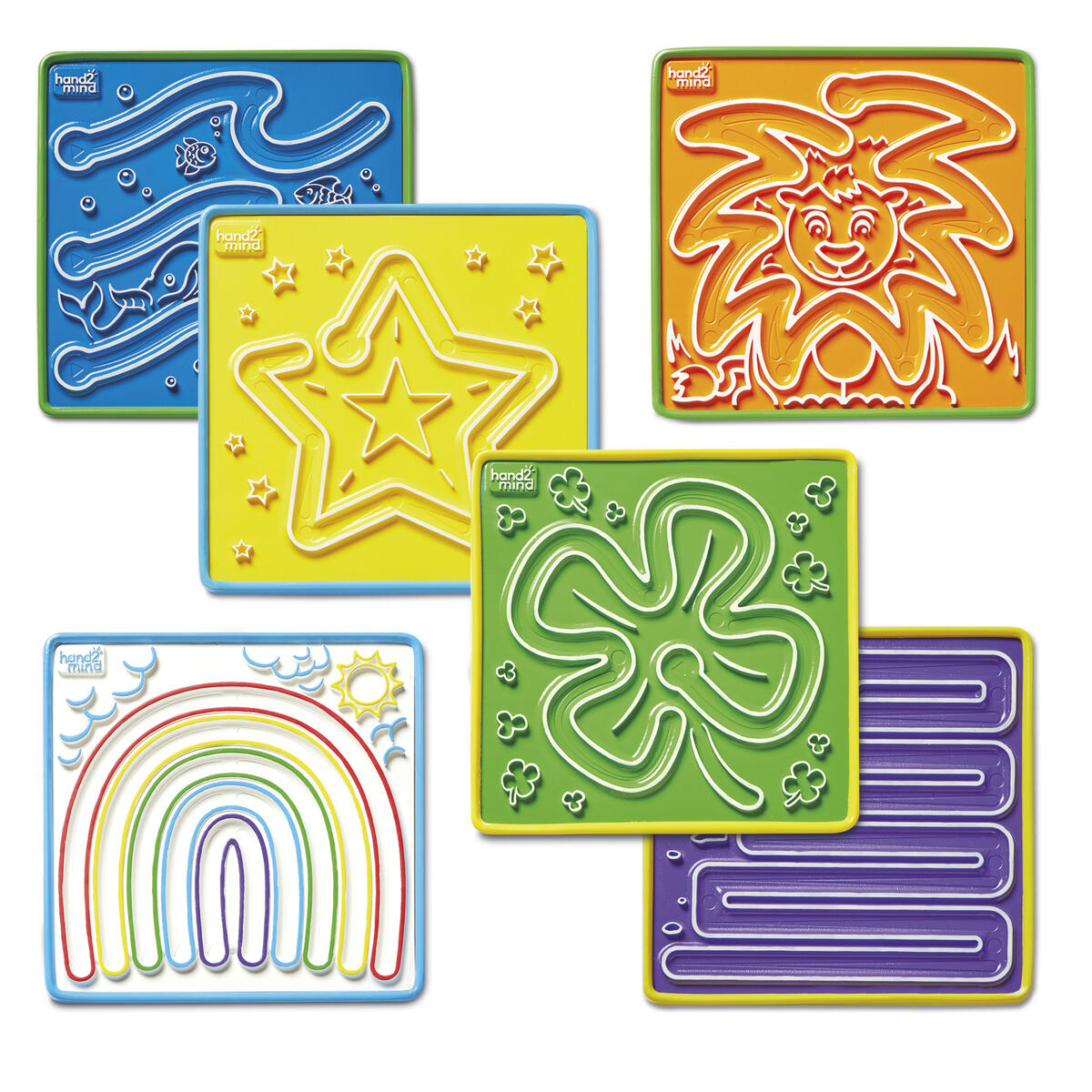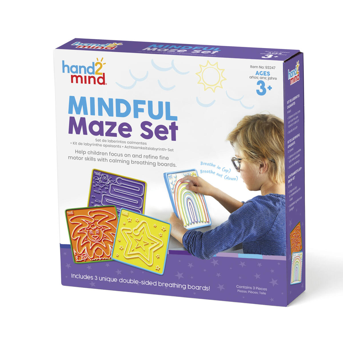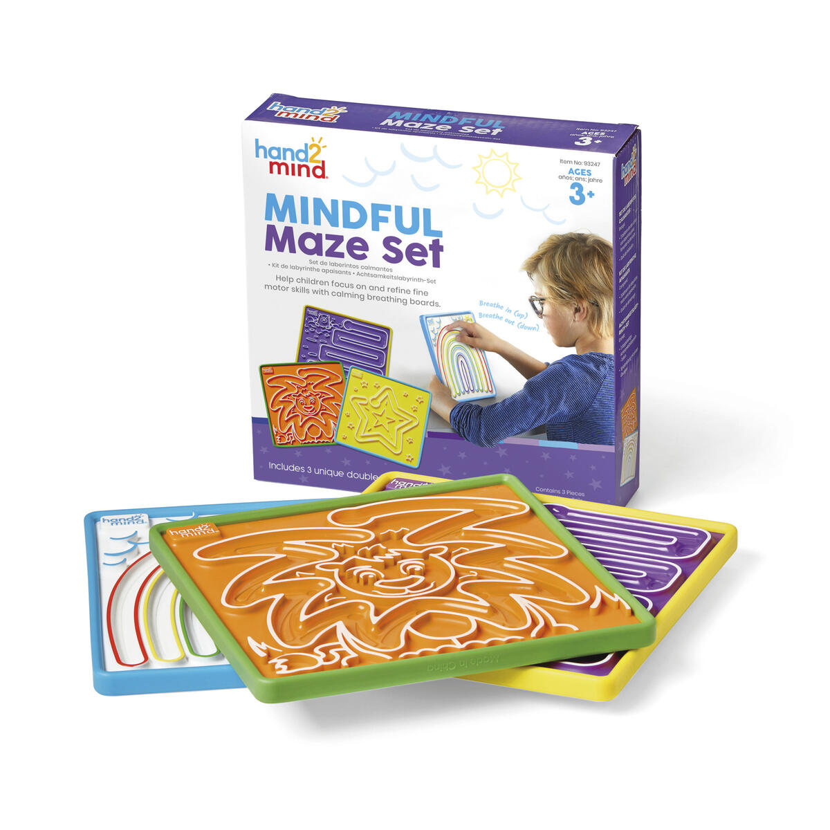 Med dessa labyrinter tränar man sin andning för att kunna hitta fokus och lugn. Barnen använder sitt pekfinger och följer spåret och andningsmönstret. Det finns 6 mönster att välja mellan, t.ex. Regnbågsandning, kvadratandning och stjärnandning. Mått: 18x18 cm. PVC-fri. Från 3 år.