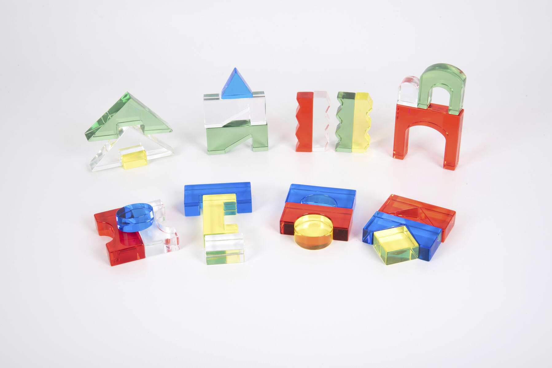 16 delar. Färgade, transparenta byggklossar som inspirerar till fantasifullt byggande. Genom att kombinera klossarna på olika sätt får barnen uppleva förändringar i färger, mönster och rumsuppfattning. Av akrylplast. PVC-fri. Från 3 år.