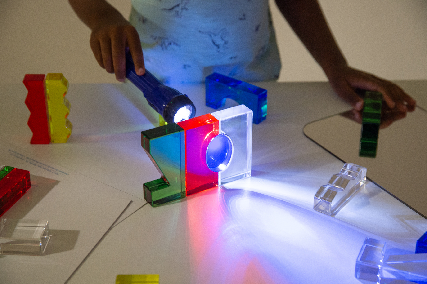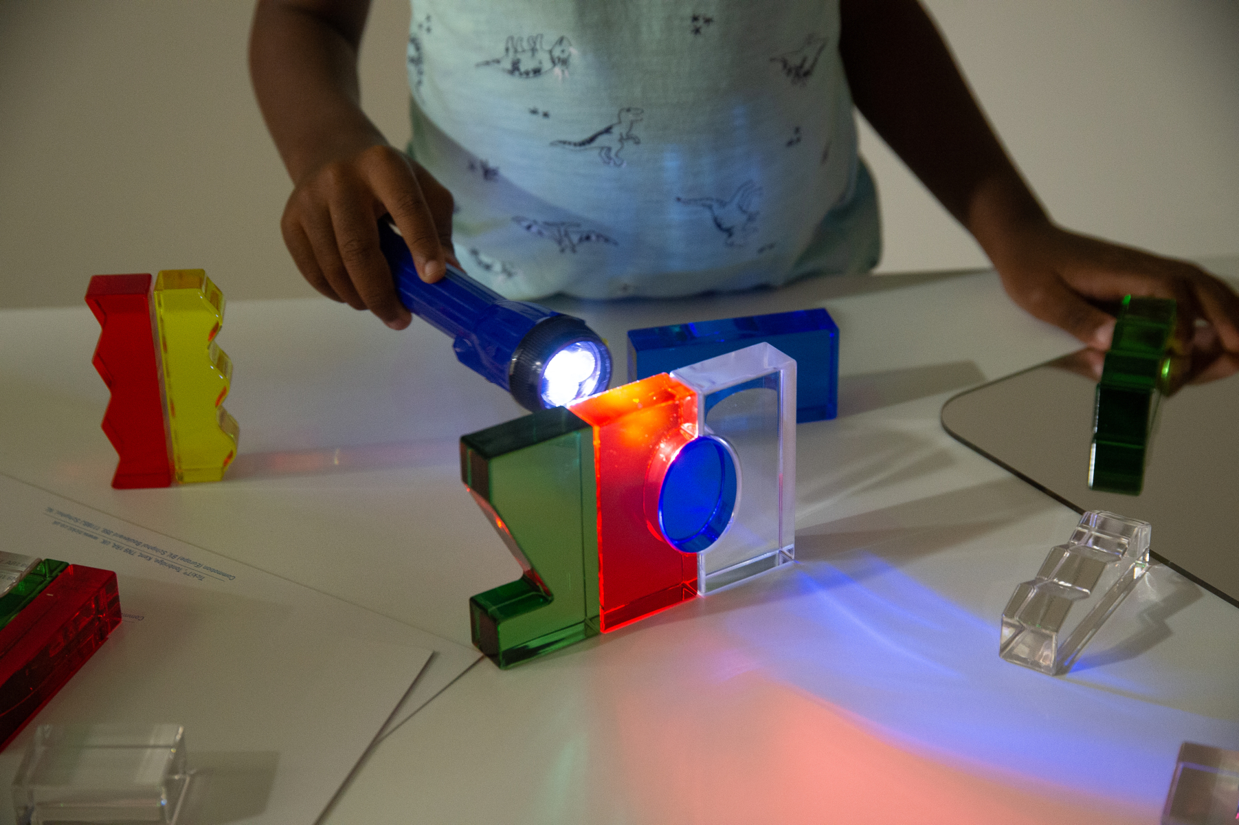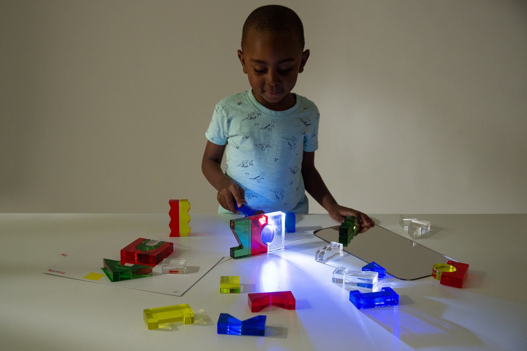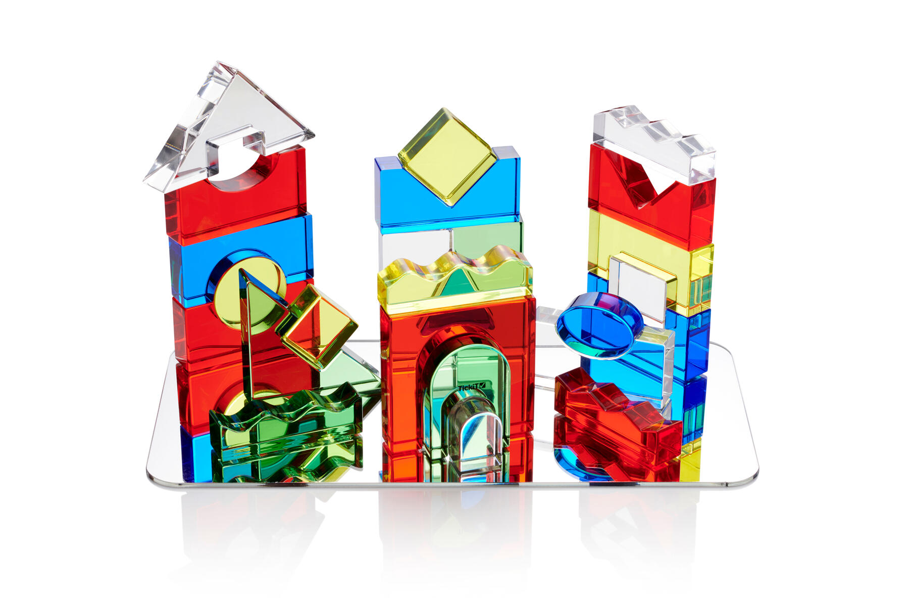 Klossar i glasklara färger och olika former. Här kan man skapa fantasifulla och vackra arkitekturer av ljus. Används med fördel på ett ljusbord eller tillsammans med speglar. Färgerna på klossarna är grön, röd, gul, rosa, blå, petrol och transparent. Formerna är kvadratiska, rektangulära, triangulära och halvklot. 14 transparenta plattor 14x14 cm ingår. Av akrylplast. Levereras i en fin förvaringslåda av trä. PVC-fri. Från 3 år.