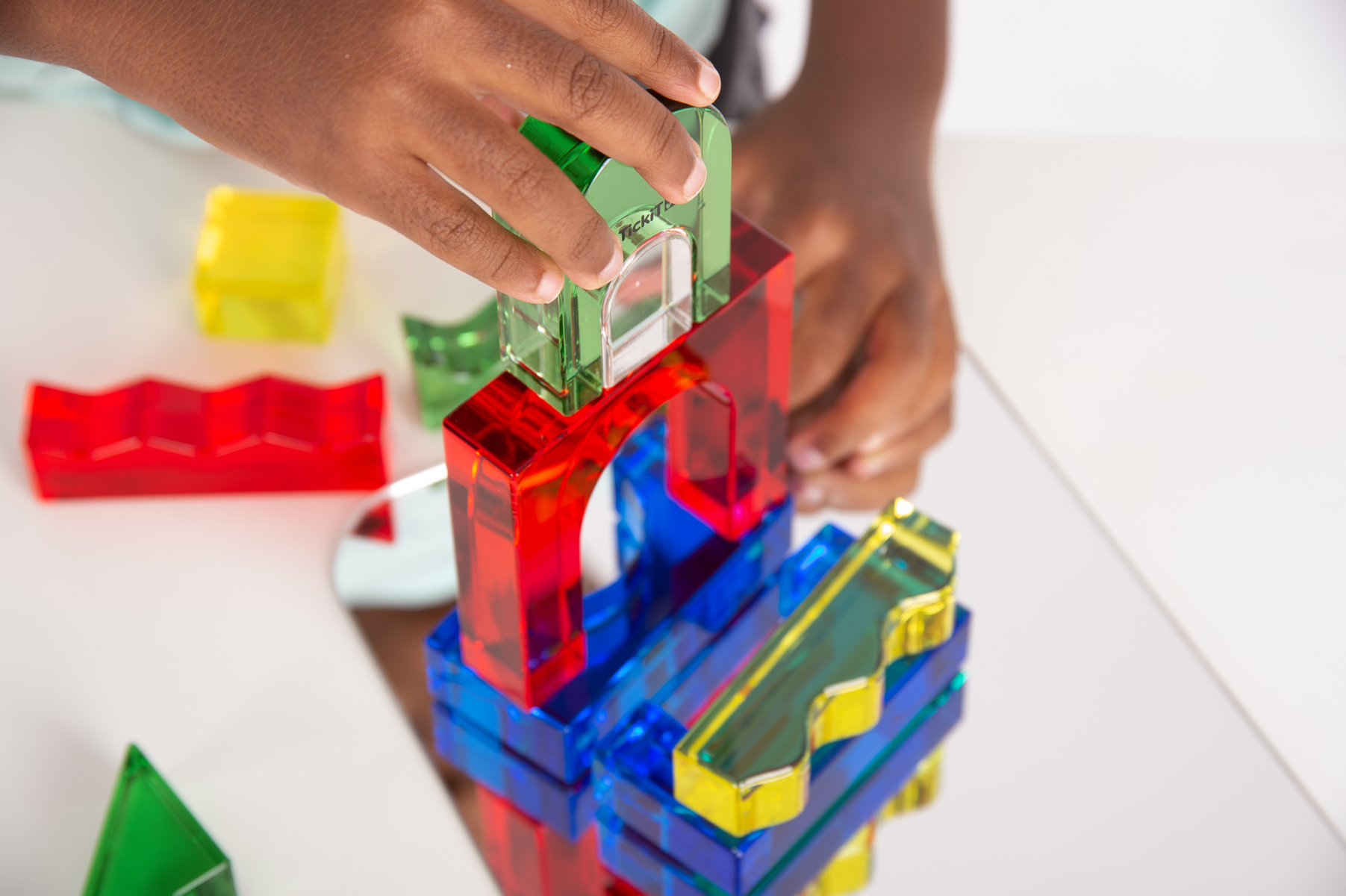 50 st/fp. Gör byggandet till ett sensoriskt äventyr! Klossarna staplas lätt på varandra och skapar olika färger när de överlappar varandra. Används med fördel på ett ljusbord. Mått: 5x6 cm. Material: PS. PVC-fri.