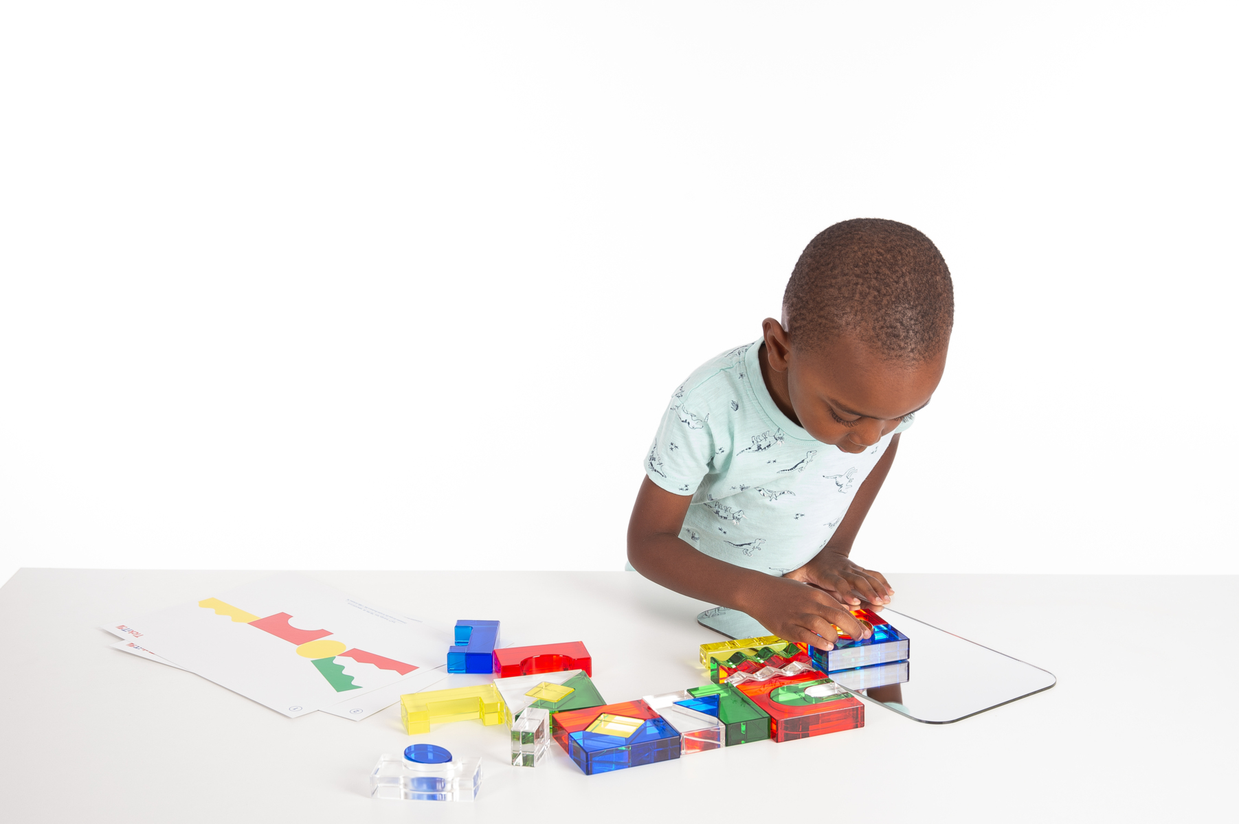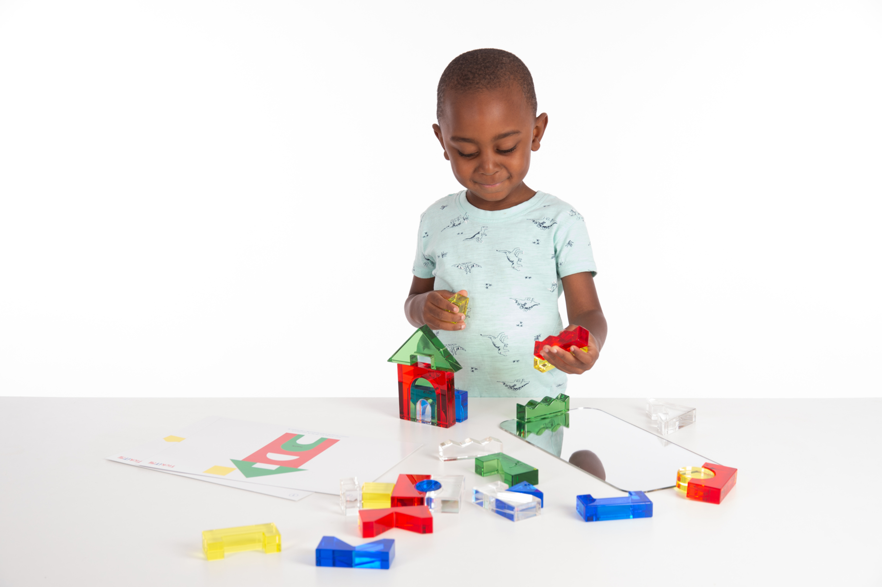 Färgstarka, transparenta klossar som kan användas inomhus och utomhus, och med fördel på ljusbord. Utforska ljus och färg, bygg mönster och sekvenser samt skapa fantasifulla bilder. Innehåller både rena former för att jobba med matematiska begrepp (kvadrat, rektangel, triangel, cirkel, ellips) och oregelbundna former för att utveckla språket med ord som våg, zickzack, båge, bro etc. Det finns bilder att kopiera och bygga upp i 2D eller 3D, formsekvenser att lösa och idéer för reflekterande symmetriarbete. Lärarhandledning ingår på 8 språk med bakgrundsinformation, föreslagna aktiviteter att prova, frågor att ställa till barnen och tilläggsidéer. Innehåller 25 klossar, en spegel och 15 arbetskort. Storlek på spegel: 16 x 32 cm. Största blockhöjd: 8 cm. Av akrylplast. PVC-fri. Från 3 år.