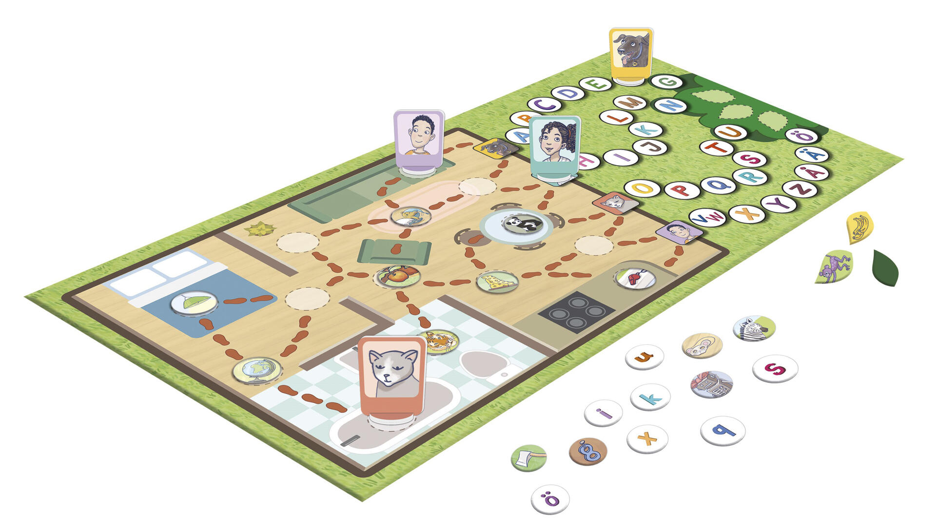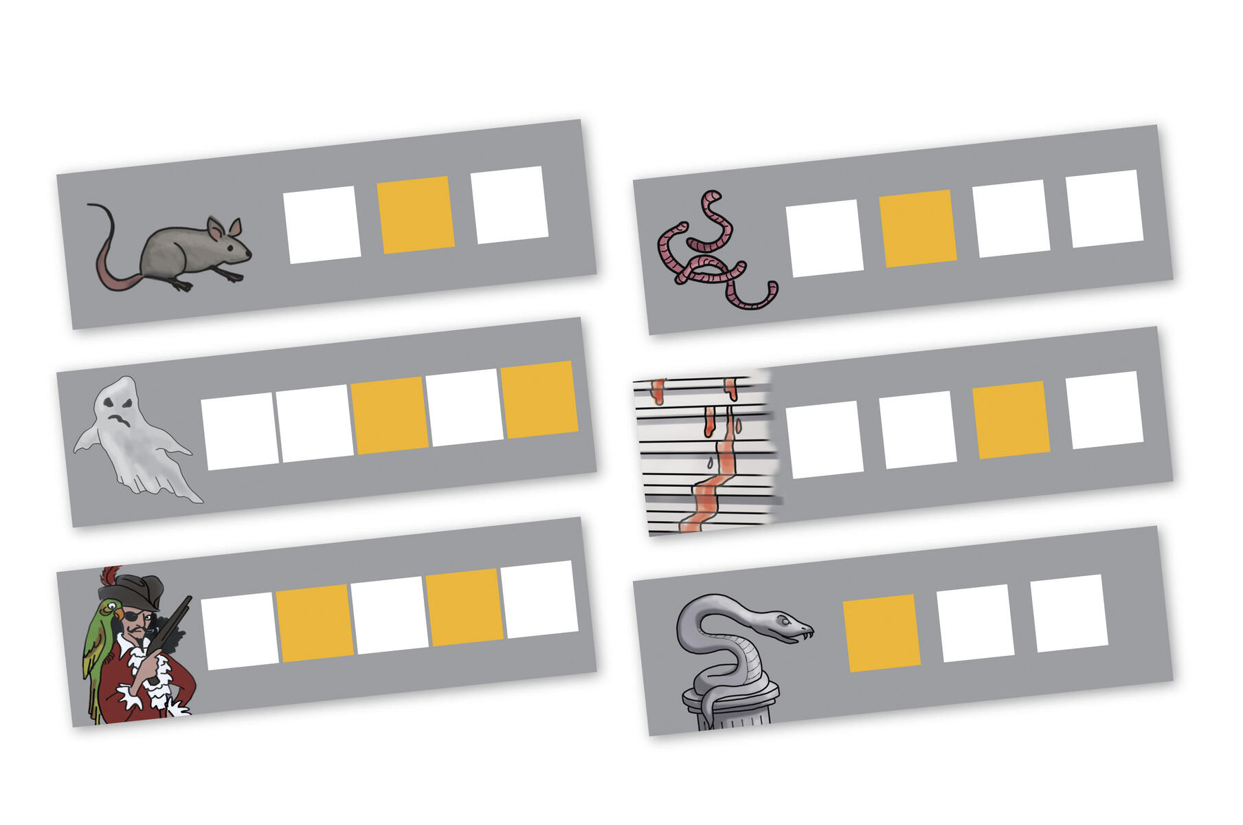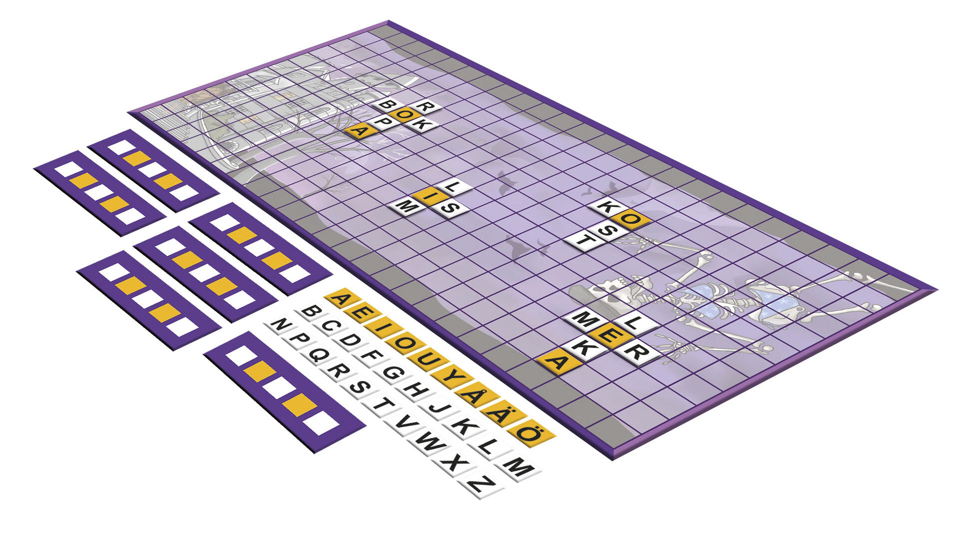 Två roliga läs- och skrivutvecklande spel i samma låda. I Apjakten går ni runt i huset och samlar bokstäver till bokstavsbanor. När din bana är fylld skyndar du dig att komma först till apan i trädet. Ett roligt sätt att arbeta med vad olika ord börjar med för bokstav. Spökfejden är ett enkelt ordbyggarspel där ni sätter ihop bokstäver till ord. Varje bokstav i ett färdigt ord ger en poäng och orden får läggas var som helst på spelplanen. Spelen passar både i skolan och hemma och är utvecklade av logopeden och författaren Elvira Ashby. Illustrationer av Micaela Favilla.