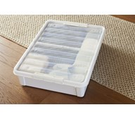 Praktisk förvaring med hjul som enkelt skjuts in under möbler. Transparent vikbart lock som synliggör innehåll. Enkel att rengöra. Mått: 79x59x18,5 cm. Av återvunnen polypropen och polyeten.