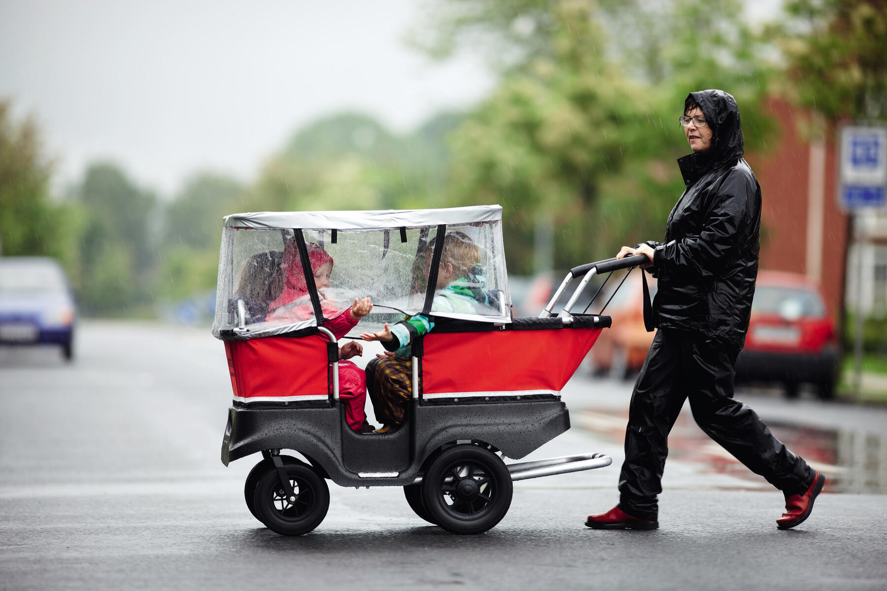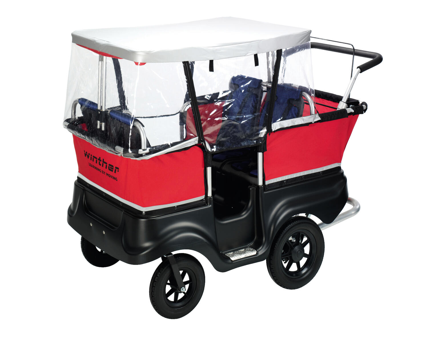 En barnbuss med plats för upp till 4 barn. Tillverkad i hård, UV-resistent polyetylen och härdat aluminium. Det röda tyget är 100 % polyester. Punkteringsfria gummihjul med kullager. Framhjulen svänger 360 grader vilket gör den enkel att styra. Trumbromsar och automatisk parkeringsbroms. Säkerhetsbälten i sitsarna. Använd alltid sele och håll alltid uppsikt över barn som sitter i en vagn. Lekolar rekommenderar en service av bromsar vartannat år. Levereras monterad.