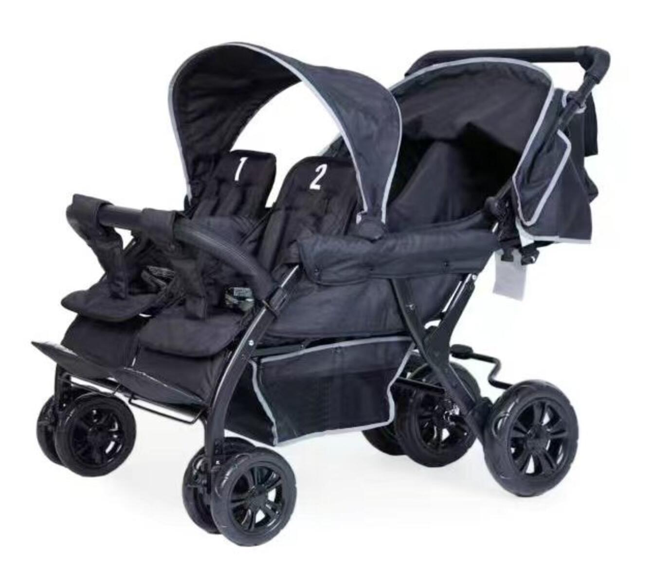 Praktisk fyrsitsig vagn med svängbara framhjul, stabilt stålchassi och individuellt justerbara ryggstöd. Varje plats har 5‑punktssele och numrerade sittplatser. Levereras med solskärmar och två stora varukorgar. Lätt att fälla ihop och utrustad med centralt bromssystem samt reflexdetaljer för extra säkerhet. Oeko-Texcertifierad, klass 1. Mått: 130x85x108 cm. Passar barn från ca 6 månader upp till 15 kg per säte.