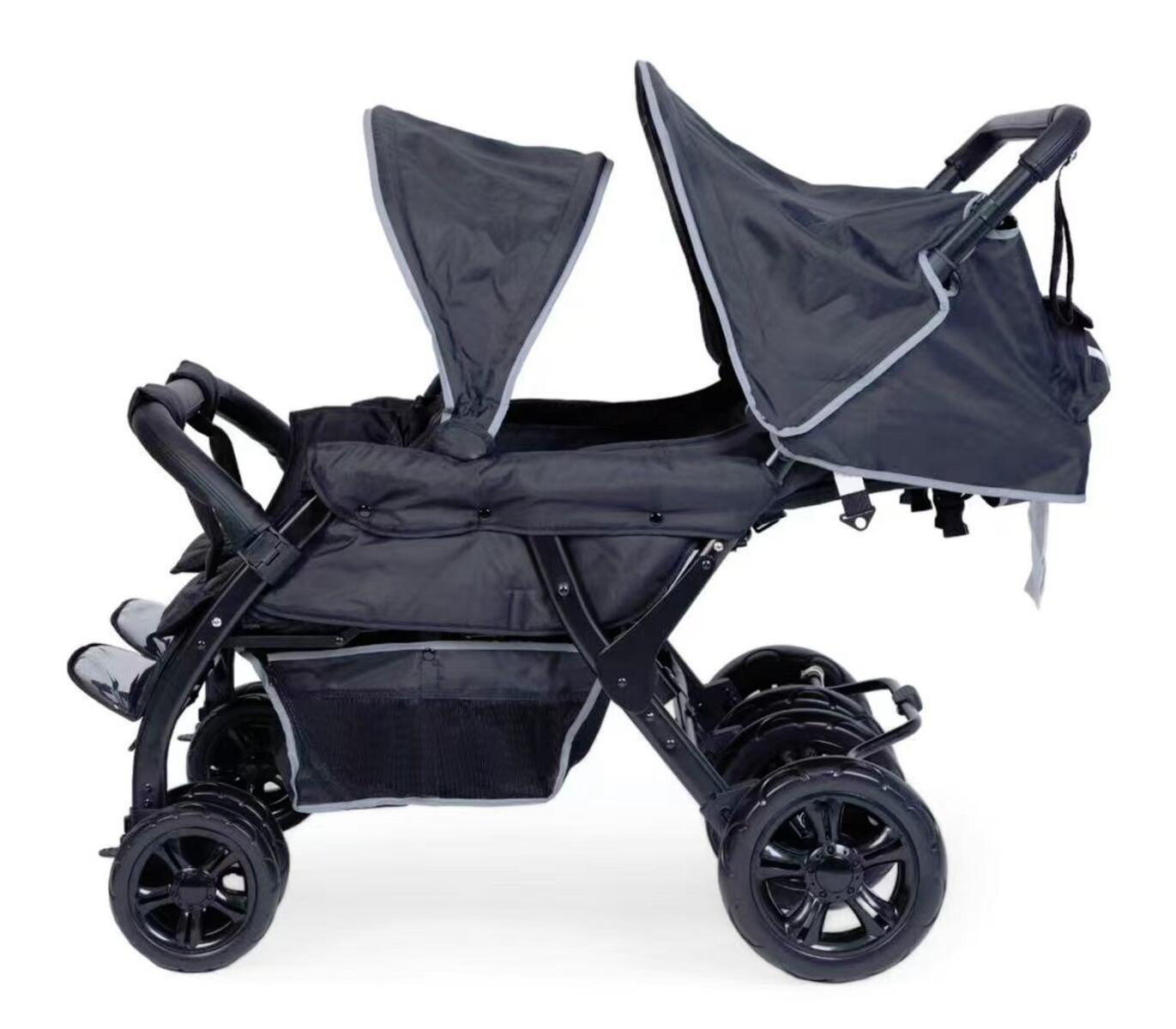 Vår syskonvagn för förskolan är klädd med ett kraftigt och vattenavvisande tyg. Vagnen levereras komplett med sufflett, fotsack, punkteringsfria däck och fyrhjulsfjädring för bättre komfort. Hjulen är avtagbara vilket förenklar rengöring och transport av vagnen. Hjulen är även försedda med kullager vilket gör vagnen lätt att köra och skön för barnen att sitta i. Vagnen har en fällbar frambåge som du enkelt kan lossa för att lättare kunna lyfta i och ur barnen. Ryggen är fällbar till liggläge. Handtaget är höj- och sänkbart i fem olika lägen 94–103 cm. Barnsele ingår. Reflexdetaljer på sufflett och frambåge. Svartlackerat chassi. Vagnens klädsel är av 100 % polyester som är Oeko-Texcertifierad, klass 1. Maxvikt i vagnen är 2x22 kg och varukorgen 10 kg.
