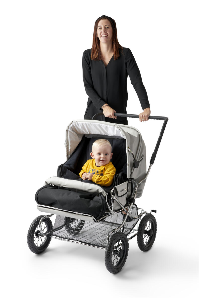 En syskonvagn med sufflett för förskolan i vattenavvisande tyg. Helt säte och varukorg. Ryggen går att ha i sittläge, viloläge samt fullt liggläge. Vagnen har punkteringsfria däck och fyrhjulsfjädring för en bättre komfort. Hjulen är försedda med kullager vilket gör vagnen lätt att köra och skön för barnen att sitta i. Hjulen är avtagbara vilket förenklar rengöring och transport av vagnen. Justerbart fotstöd. Vagnen har en fällbar frambåge som du enkelt kan lossa för att lättare kunna lyfta i och ur barnen. Fempunktssele ingår. Svartlackerat chassi. Bredd 74 cm. Handtaget är höj- och sänkbart i fem olika lägen 94–103 cm. Maxvikt i vagnen är 2x22 kg och varukorgen 10 kg. Sittmått: 49x28 cm. Ryggstöd: 92 cm. Hjul: ø30 cm. Vagnens klädsel är av 100 % polyester som är Oeko-Texcertifierad klass 1. Avtorkningsbar.