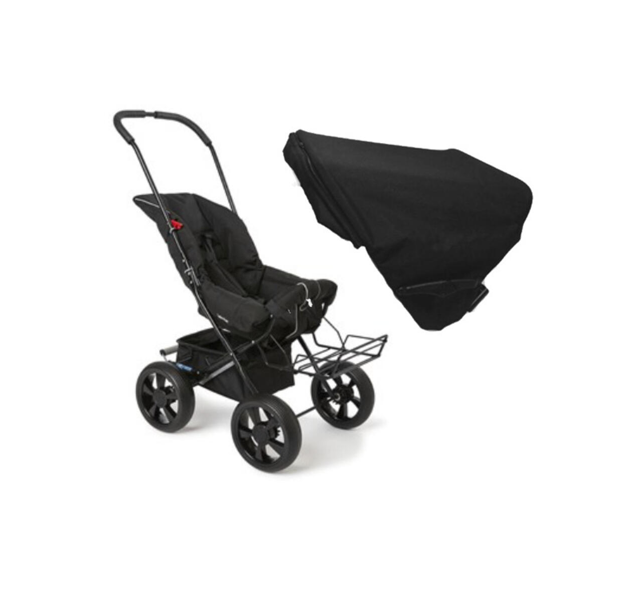 En syskonvagn med sufflett för förskolan i vattenavvisande tyg. Helt säte och varukorg. Ryggen går att ha i sittläge, viloläge samt fullt liggläge. Vagnen har punkteringsfria däck och fyrhjulsfjädring för en bättre komfort. Hjulen är försedda med kullager vilket gör vagnen lätt att köra och skön för barnen att sitta i. Hjulen är avtagbara vilket förenklar rengöring och transport av vagnen. Justerbart fotstöd. Vagnen har en fällbar frambåge som du enkelt kan lossa för att lättare kunna lyfta i och ur barnen. Fempunktssele ingår. Svartlackerat chassi. Bredd 74 cm. Handtaget är höj- och sänkbart i fem olika lägen 94–103 cm. Maxvikt i vagnen är 2x22 kg och varukorgen 10 kg. Sittmått: 49x28 cm. Ryggstöd: 92 cm. Hjul: ø30 cm. Vagnens klädsel är av 100 % polyester som är Oeko-Texcertifierad klass 1. Avtorkningsbar.