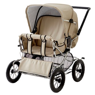 En syskonvagn med sufflett för förskolan i vattenavvisande tyg. Helt säte och varukorg. Ryggen går att ha i sittläge, viloläge samt fullt liggläge. Vagnen har punkteringsfria däck och fyrhjulsfjädring för en bättre komfort. Hjulen är försedda med kullager vilket gör vagnen lätt att köra och skön för barnen att sitta i. Hjulen är avtagbara vilket förenklar rengöring och transport av vagnen. Justerbart fotstöd. Vagnen har en fällbar frambåge som du enkelt kan lossa för att lättare kunna lyfta i och ur barnen. Fempunktssele ingår. Svartlackerat chassi. Bredd 74 cm. Handtaget är höj- och sänkbart i fem olika lägen 94–103 cm. Maxvikt i vagnen är 2x22 kg och varukorgen 10 kg. Sittmått: 49x28 cm. Ryggstöd: 92 cm. Hjul: ø30 cm. Vagnens klädsel är av 100 % polyester som är Oeko-Texcertifierad klass 1. Avtorkningsbar.