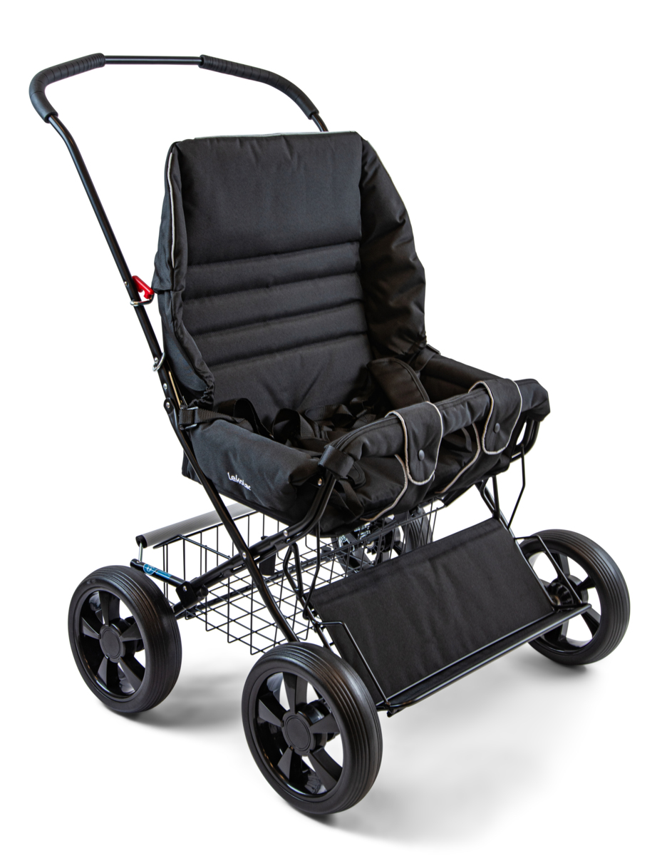 En smidig syskonsulky med klädsel av polyuretan, som är lätt att torka av. Reglerbart rygg- och fotstöd. Levereras med barnsele, punkteringsfria däck och svart lackerat chassi. Hjulen är avtagbara vilket förenklar rengöring och transport av vagnen. Vagnen har bakhjulsfjädring och reflexdetaljer på frambågen. Klädseln är avtagbar. Använd alltid barnsele och håll alltid uppsikt över barn som sitter i en barnvagn. Maxvikt i vagnen är 2x22 kg och varukorgen 10 kg.